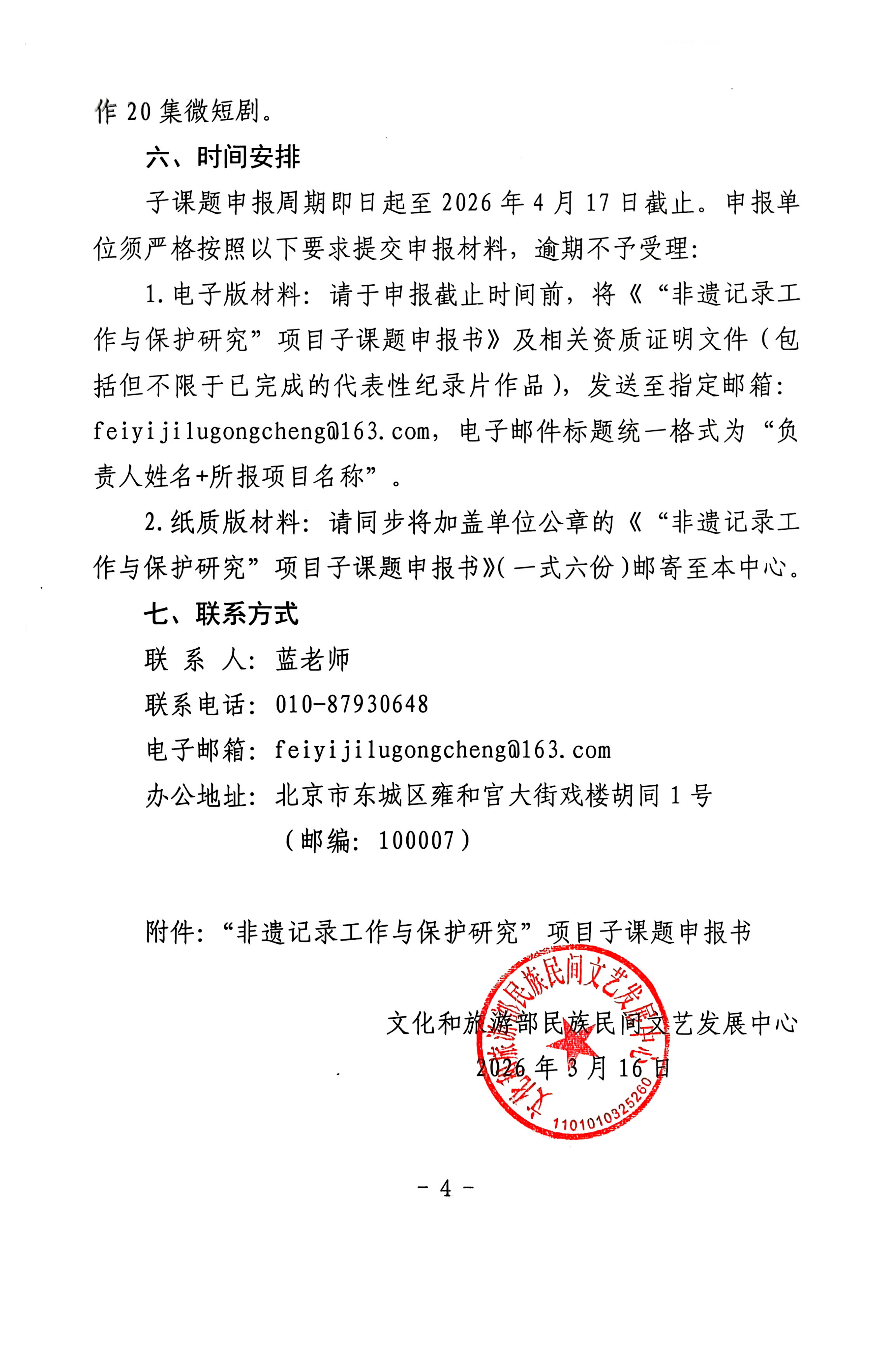 现将《2026年度“非物质文化遗产记录工作与保护研究”项目子课题申报通知》转发给你们,请按通知要求组织申报,统一由科研秘书于4月14日前前往科研部办理现场审核及盖章程序。
