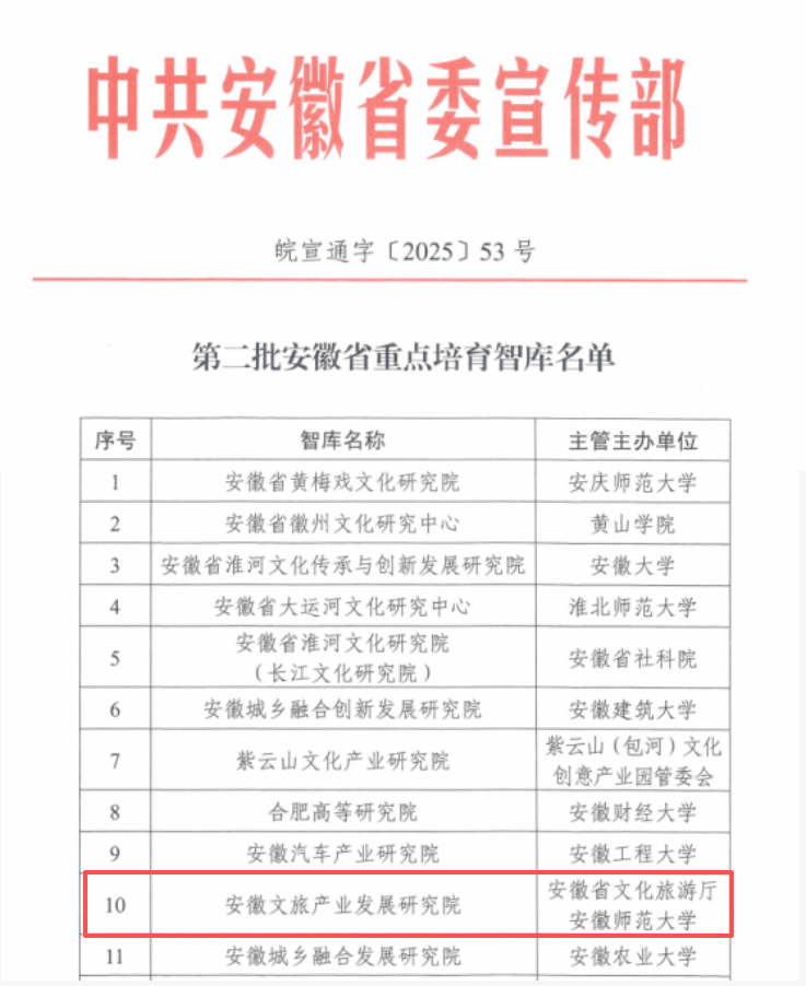 日前安徽省委宣传部公布了第二批安徽省重点培育智库名单,由我校和安徽省文旅厅共建的安徽文旅产业发展研究院,获得立项批准。安徽文旅产业研究院是以安徽师范大学文旅产业研究院(安徽旅游智库)为基础发起设立,并由安徽省文化和旅游厅、黄山股份、九华股份、安徽环球文旅等校政企合作共建的高端智库平台。