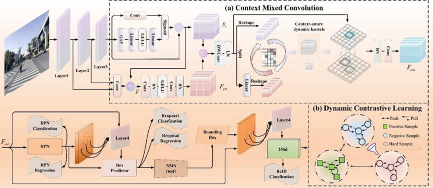 行人搜索是计算机视觉领域的关键任务,需在未裁剪的复杂图像中同时完成行人检测与身份重识别。当前主流方法面临三大核心瓶颈:遮挡问题导致局部特征失真、姿态变化引发特征错位、尺度差异影响模型泛化能力。现有数据集多聚焦于校园、街道等静态场景,缺乏动态交通环境中的复杂交互场景,难以满足真实城市监控的需求。针对该问题,我们构建了首个面向电动自行车骑手的大规模基准数据集EBRS,并且设计了一个上下文感知的动态对比学习网络。该网络通过通道和空间双路径校准捕捉特征依赖,生成上下文感知的动态卷积核,可根据场景信息调整感受野大小,同时实现局部细节保留与全局结构建模。在EBRS数据集上的大量实验结果表明,本文提出的框架在各项核心指标上均达到了业界领先水平。