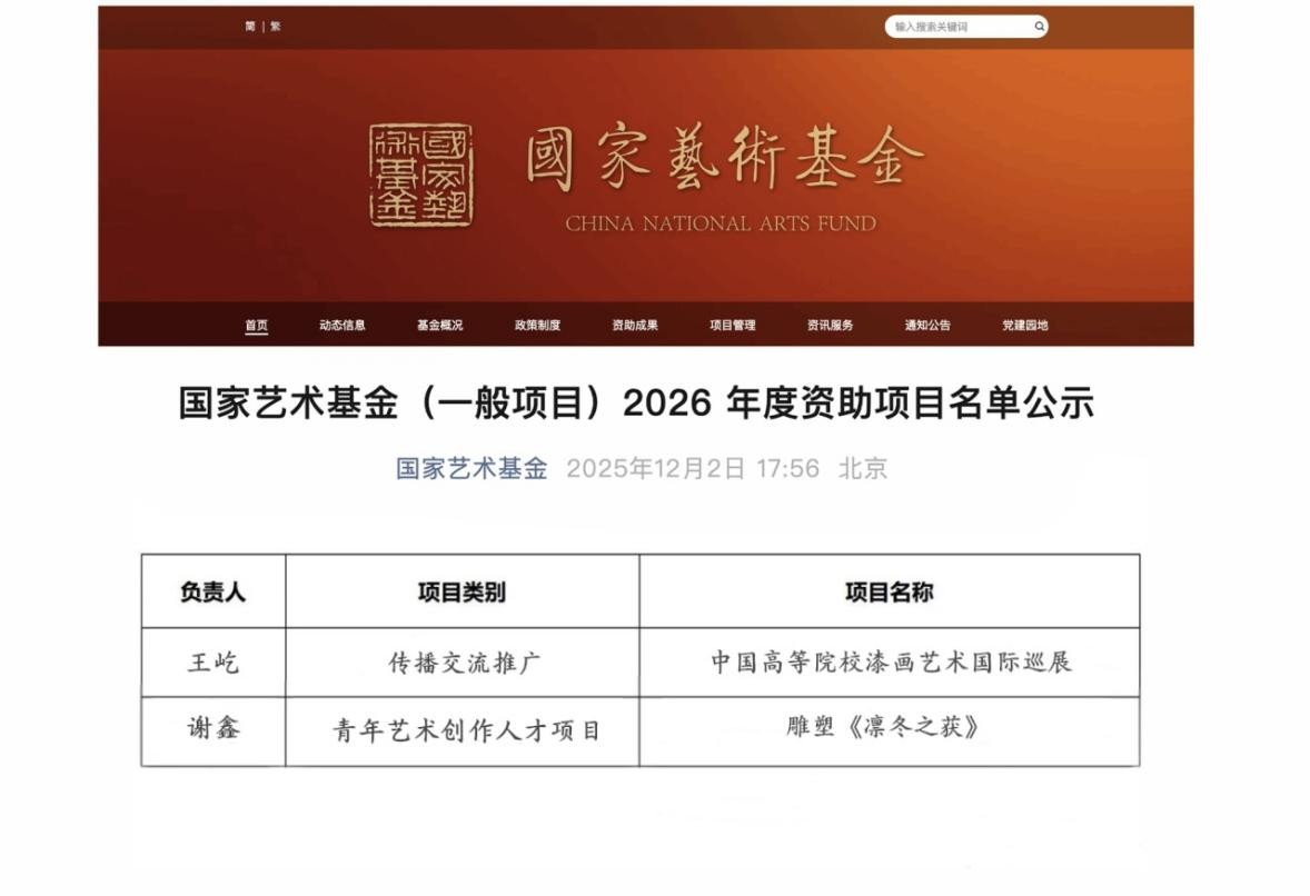 近日,国家艺术基金(一般项目)2026年度资助项目公示名单发布,我校共有2个项目获批立项,分别是美术学院王屹教授主持的传播交流推广项目(立项经费120万元)和谢鑫老师主持的青年艺术创作人才项目(立项经费10万元),其中传播交流推广项目实现了学校在美术国际巡展领域的历史性突破,彰显了学校师生们持续高涨的创作热情和深厚的创作实力。