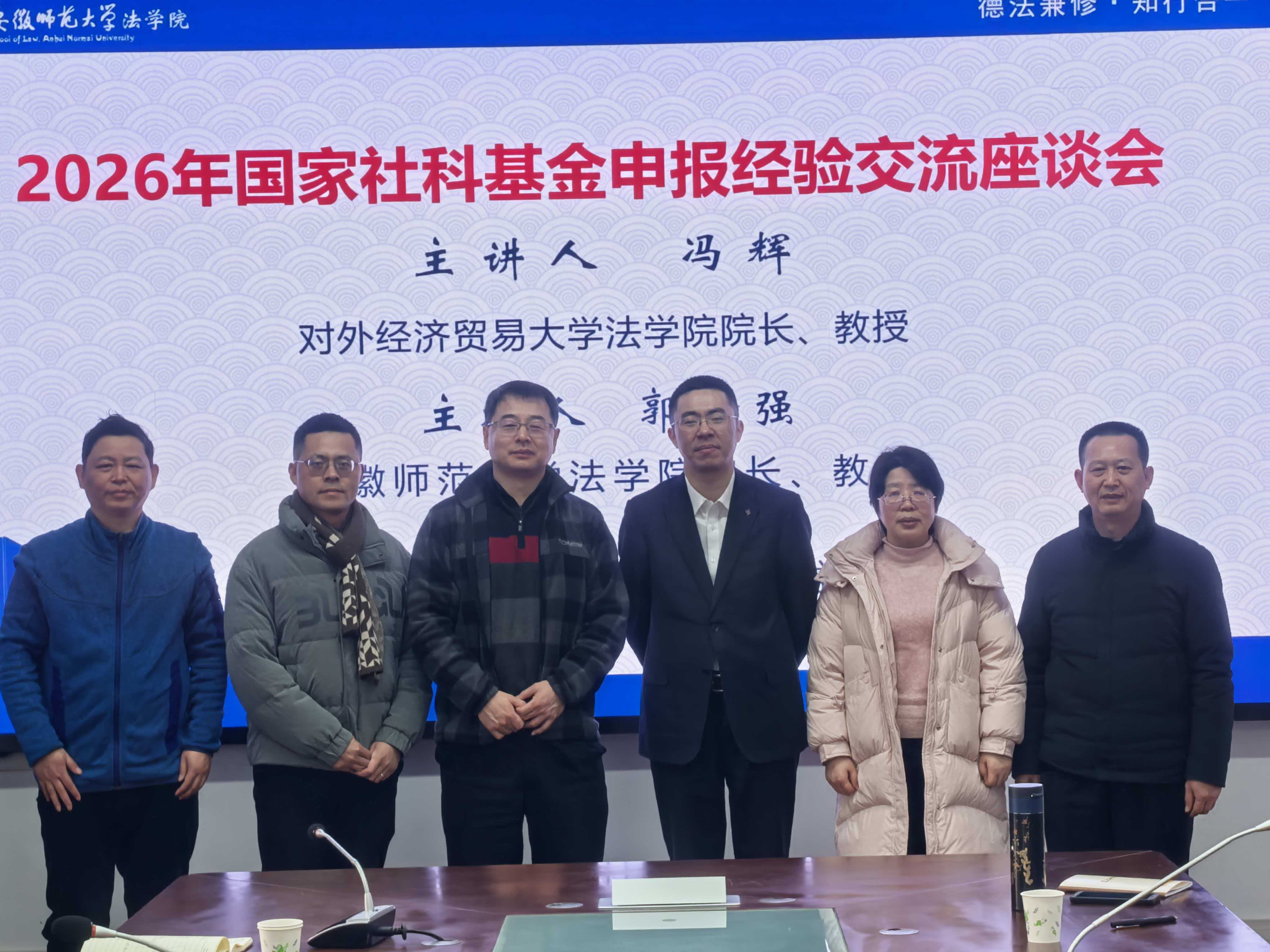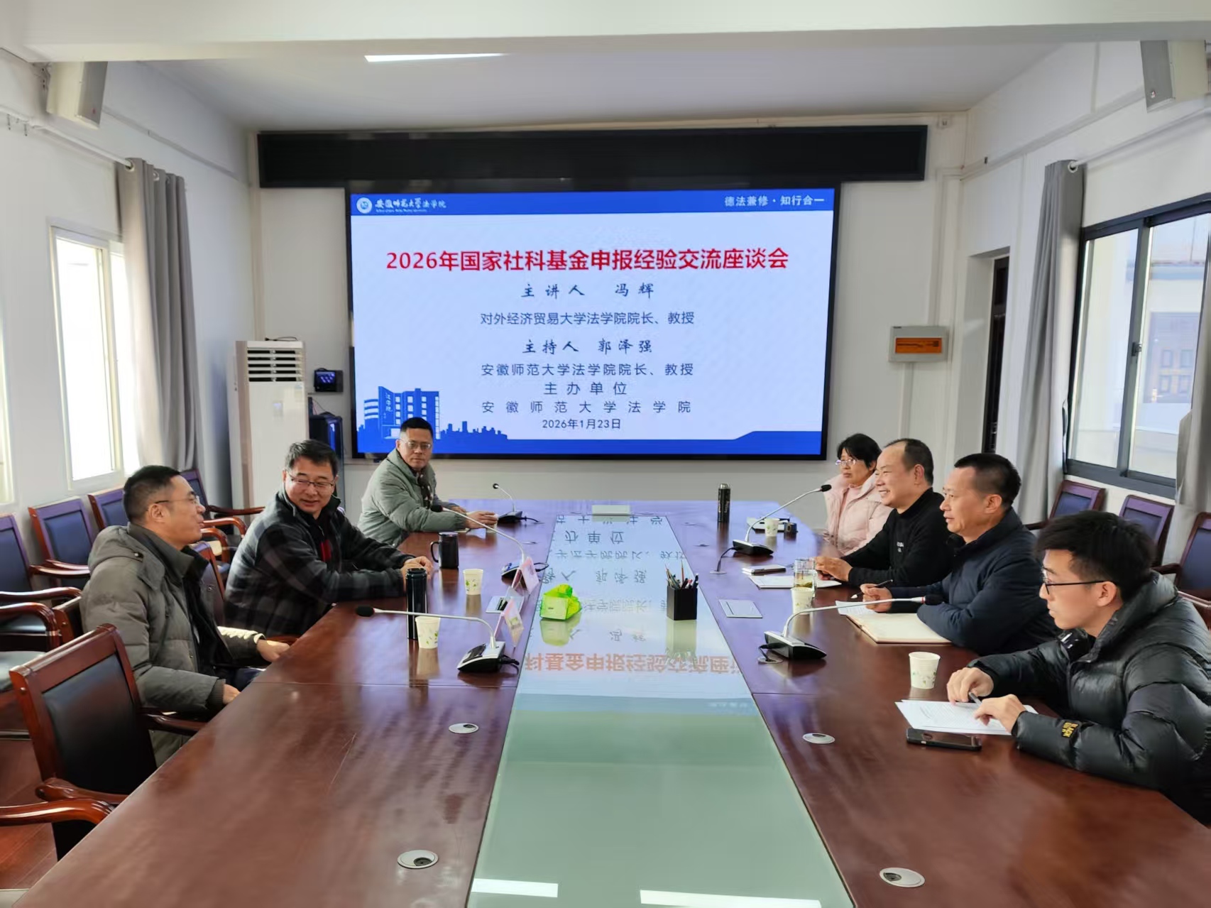 为提升学院教师国家社科基金项目申报质量,精准把握申报要点与技巧,助力教师成功立项,1 月 23 日下午,法学院在学院会议室举办“2026 年国家社科基金申报经验交流座谈会”。本次座谈会特邀对外经济贸易大学法学院院长、博士生导师冯辉教授担任主讲人,法学院院长郭泽强教授主持会议,学院拟申报 2026 年国家社科基金项目的教师参会交流。