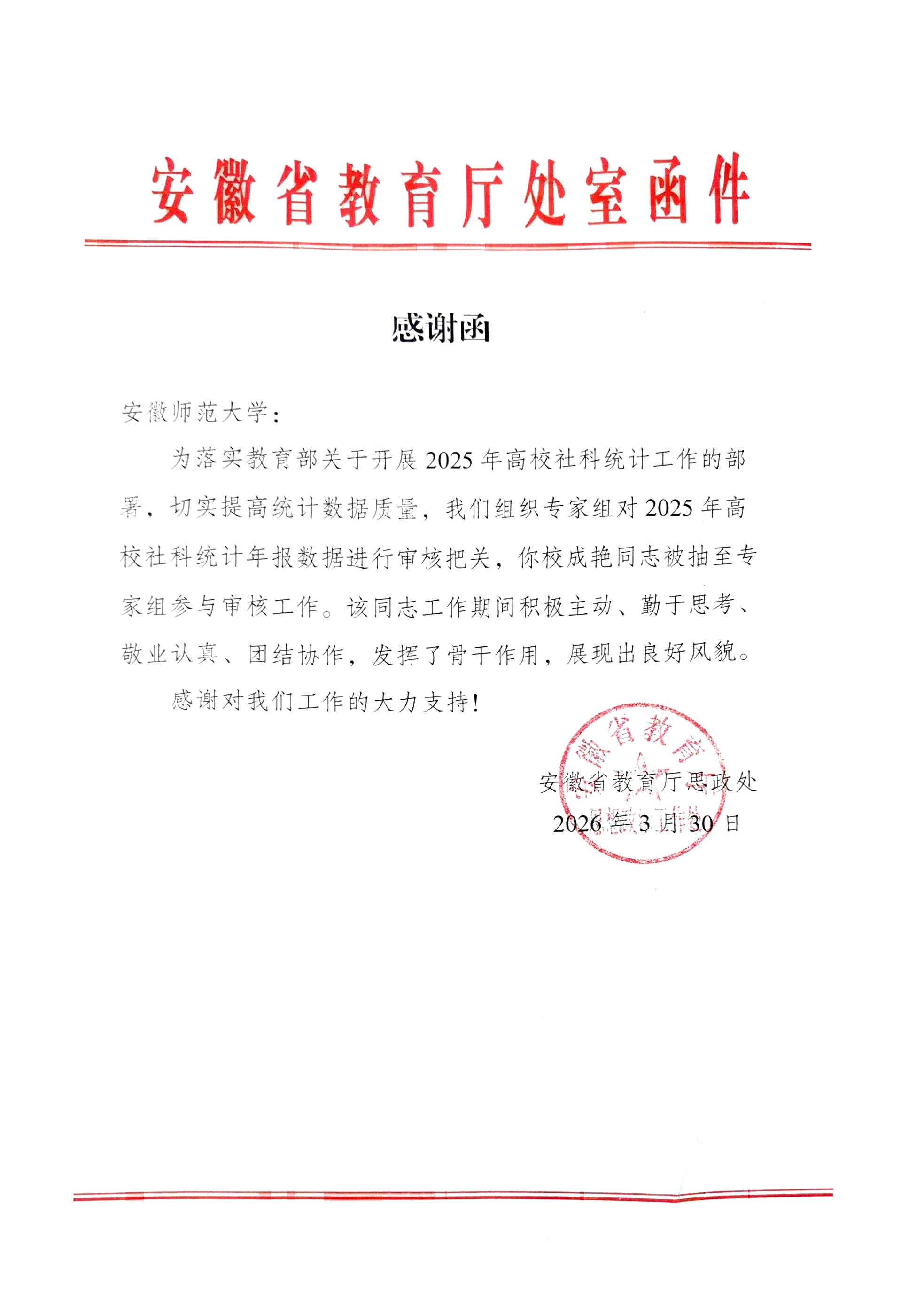 近日,安徽省教育厅思政处专门致函我校,向科研部成艳同志大力支持工作表达谢意。对该同志参与其组织专家组对2025年高校社科统计年报数据进行审核把关的专业表现给予高度评价。