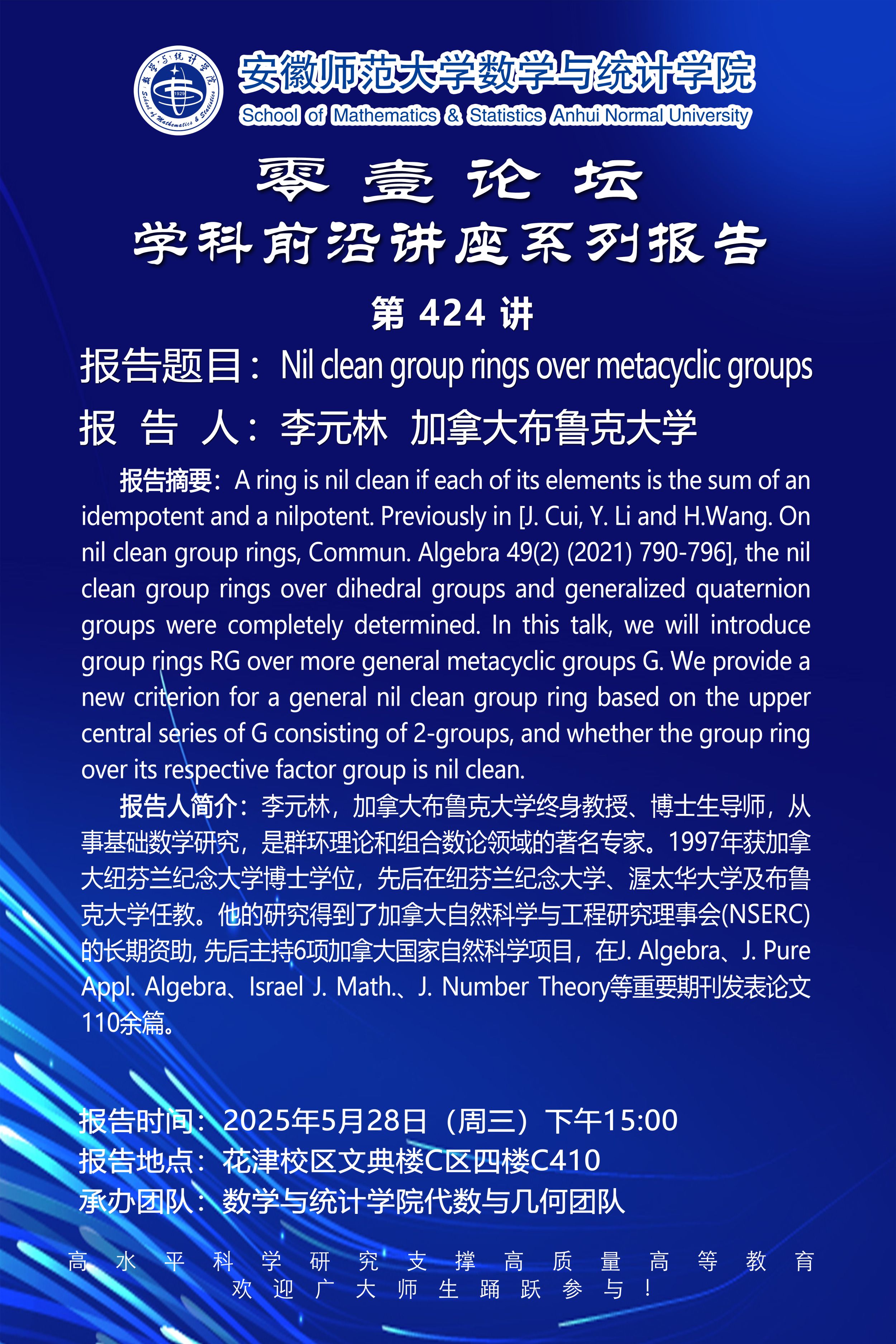 【学术预告】数统学院零壹论坛第424讲:Nil clean group rings over metacyclic groups
