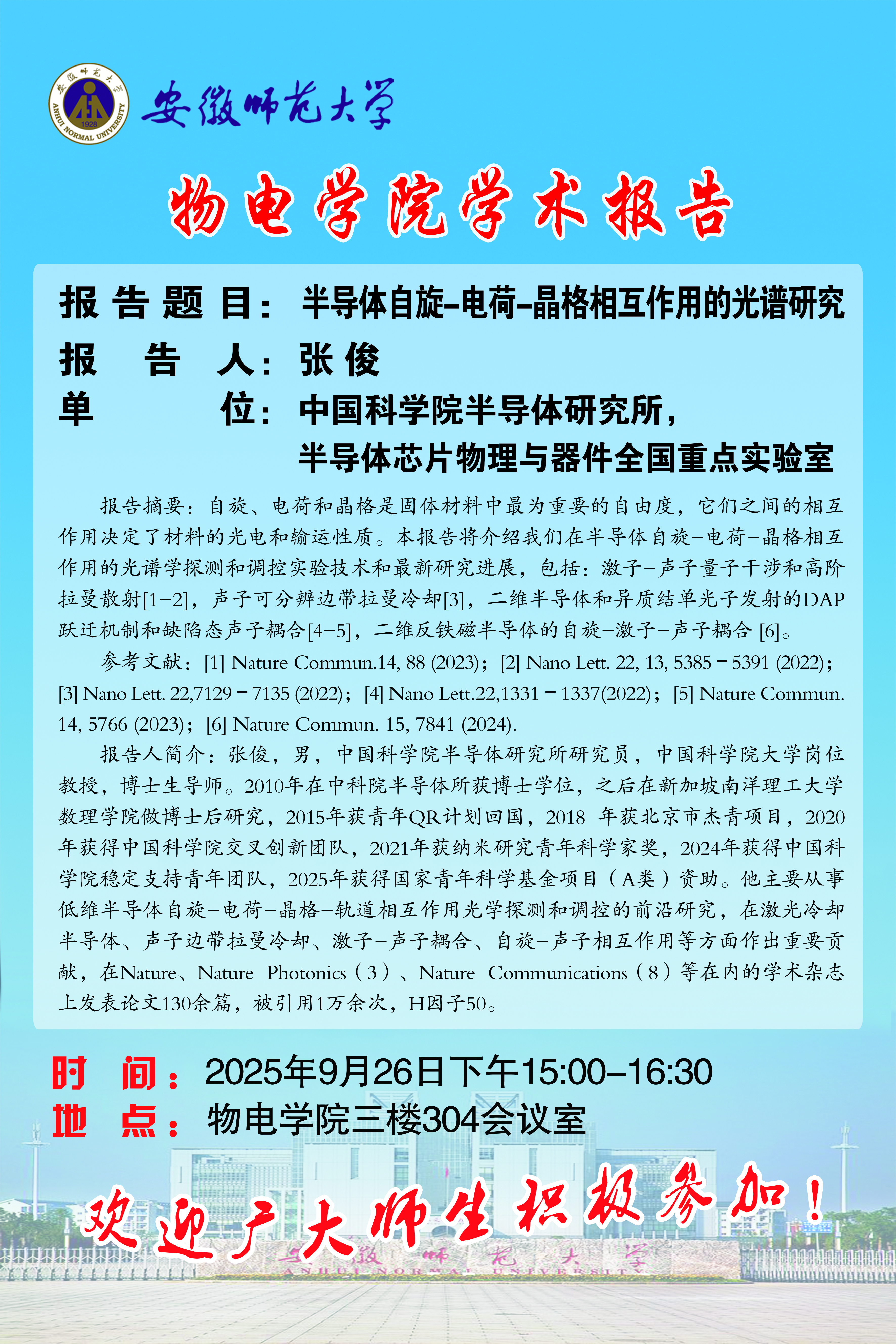 【学术预告】物电讲坛2025年第35期:半导体自旋-电荷-晶格相互作用的光谱研究