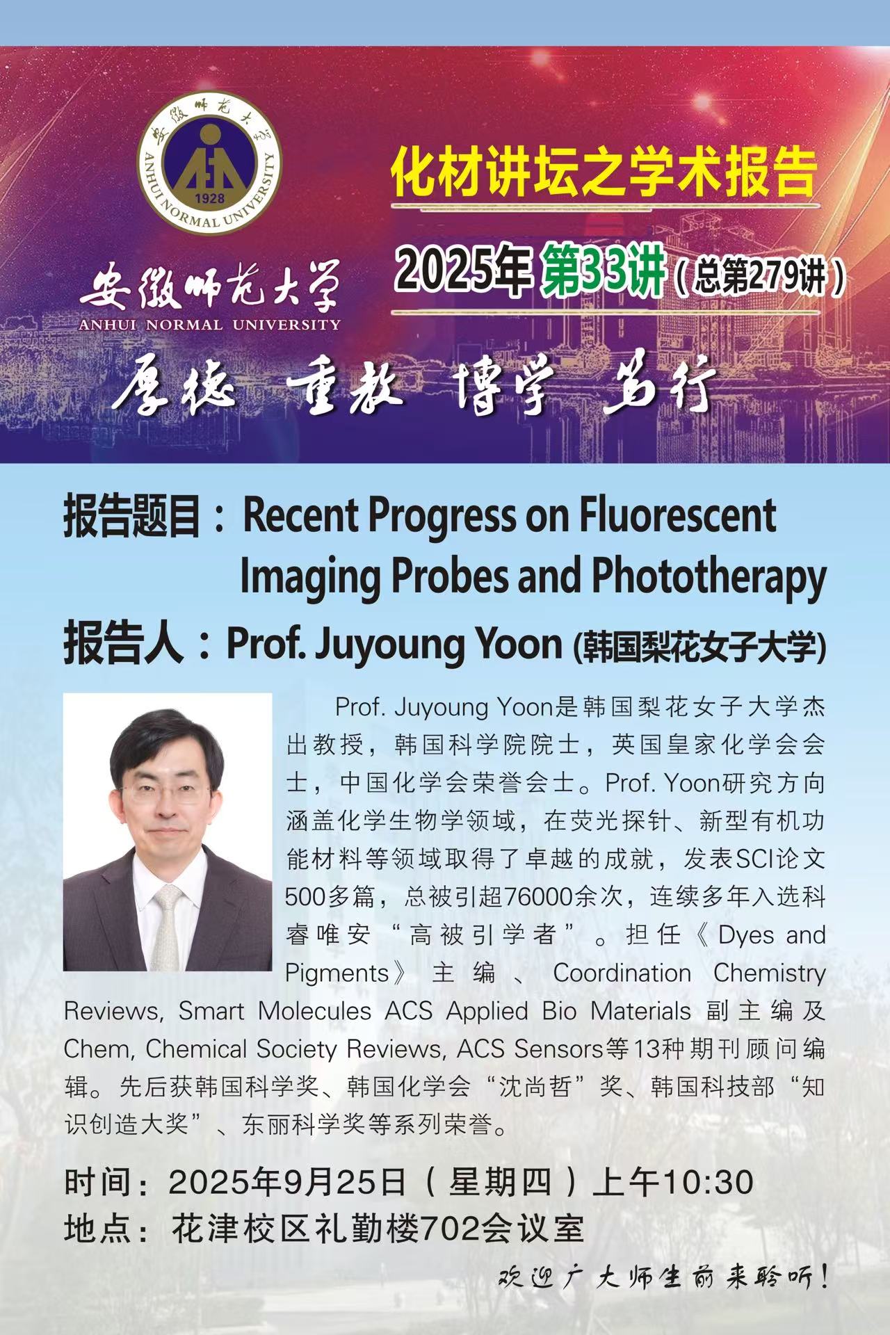 【学术预告】化材讲坛2025年第33讲:Recent Progress on Fluorescent Imaging Probes and Phototherapy