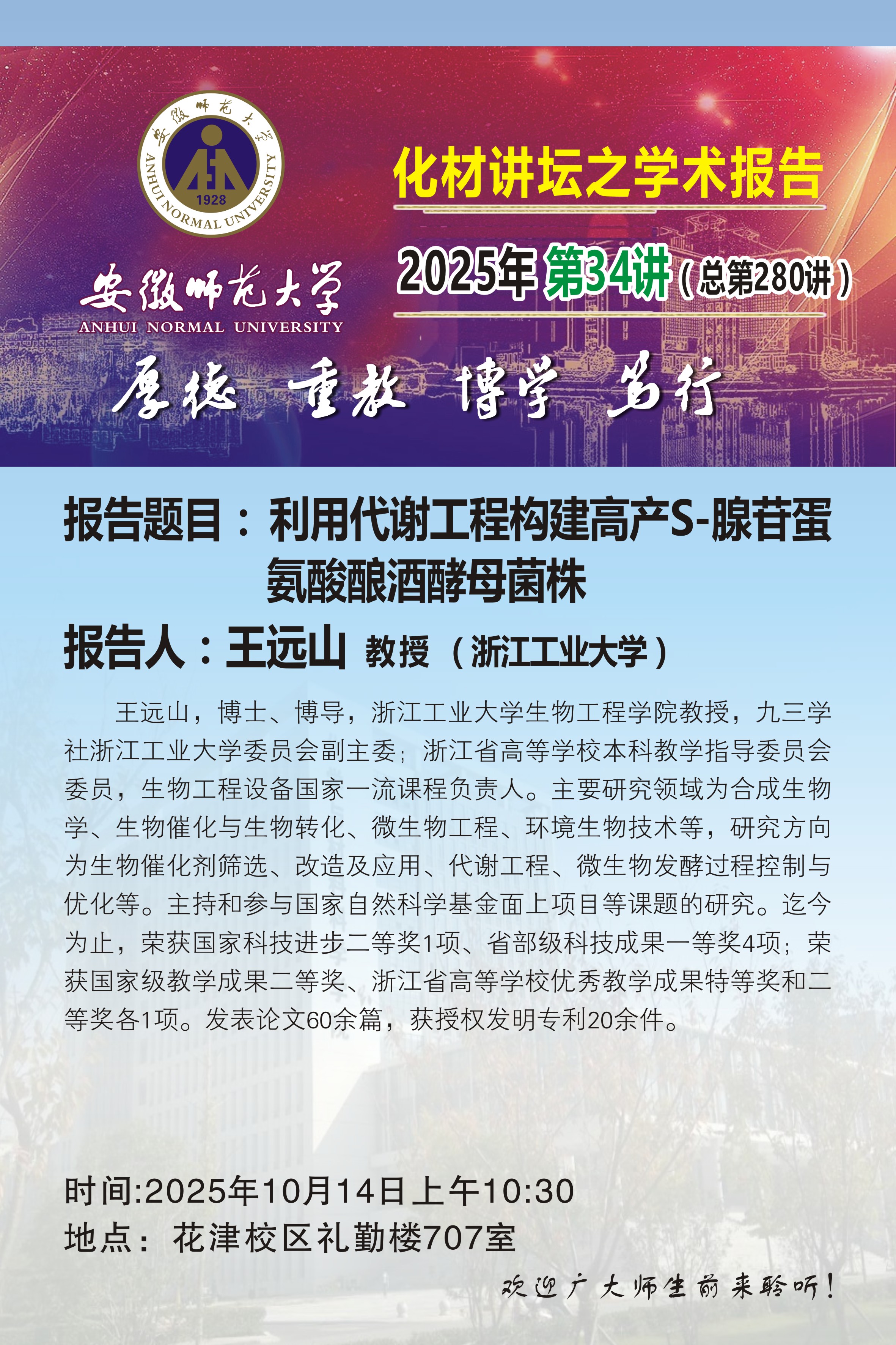 【学术预告】化材讲坛2025年第34讲:利用代谢工程构建高产S-腺苷蛋氨酸酿酒酵母菌株