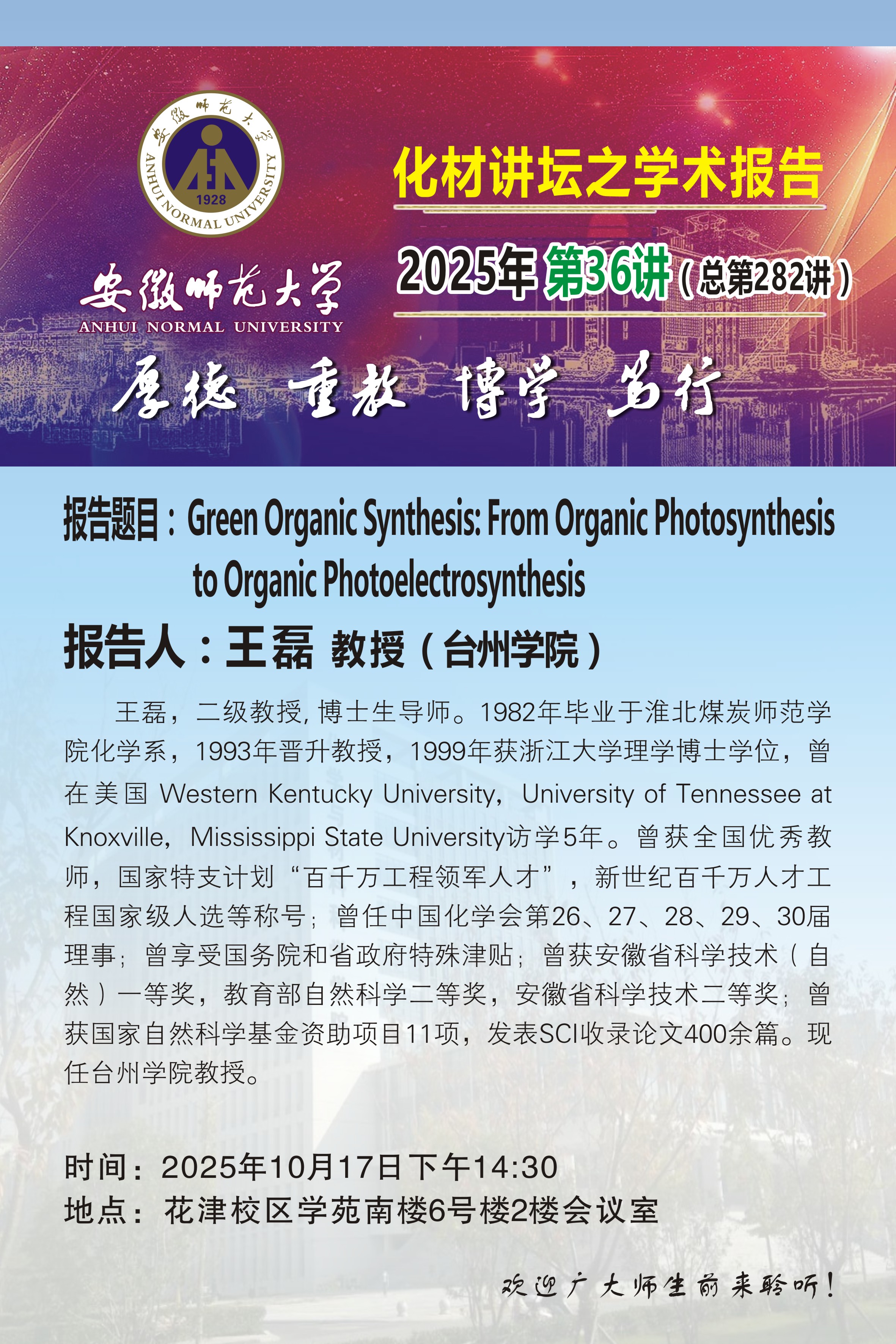 【学术预告】化材讲坛2025年第36讲:Green Organic Synthesis: From Organic Photosynthesis to Organic Photoelectrosynthesis