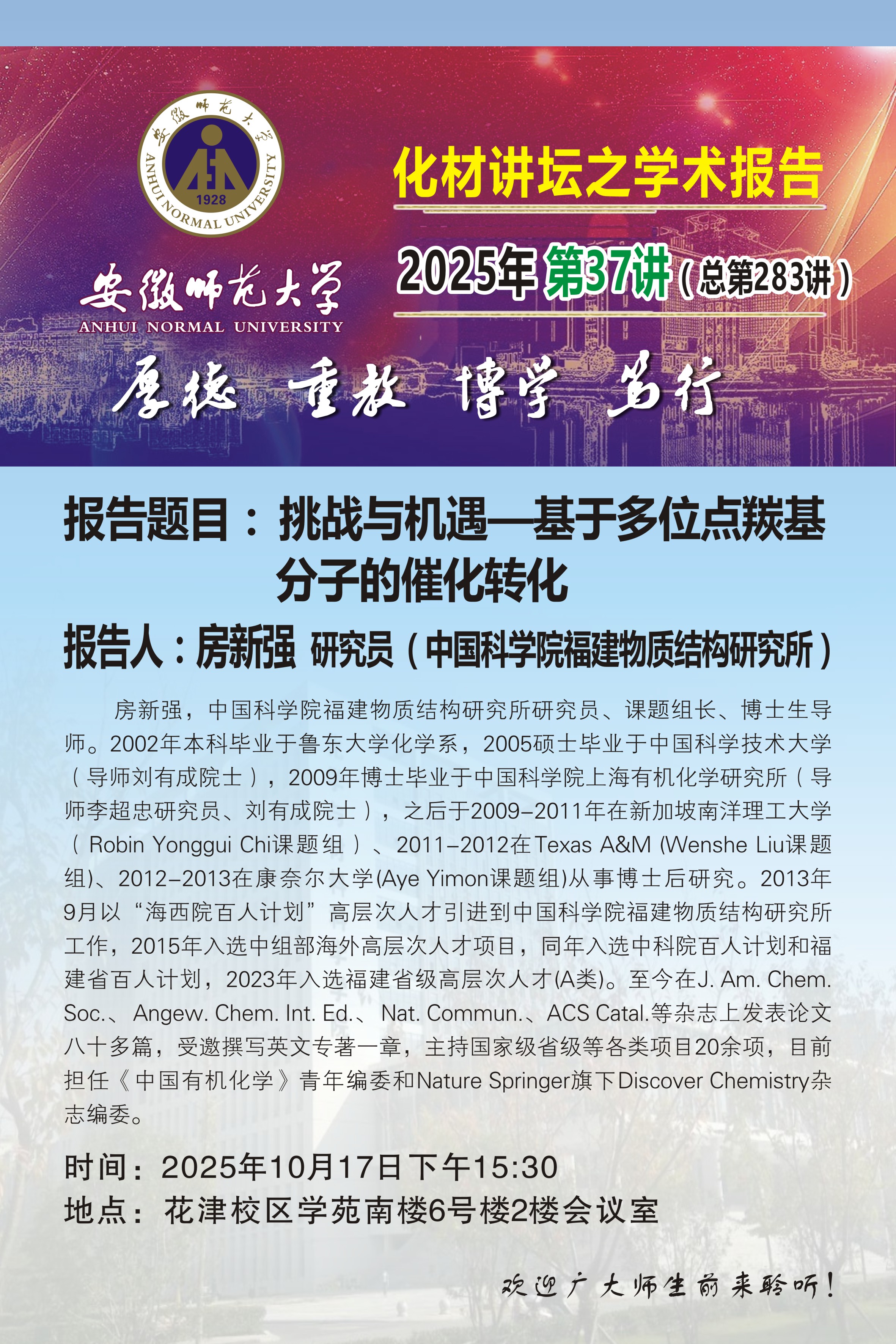 【学术预告】化材讲坛2025年第37讲:挑战与机遇—基于多位点羰基分子的催化转化