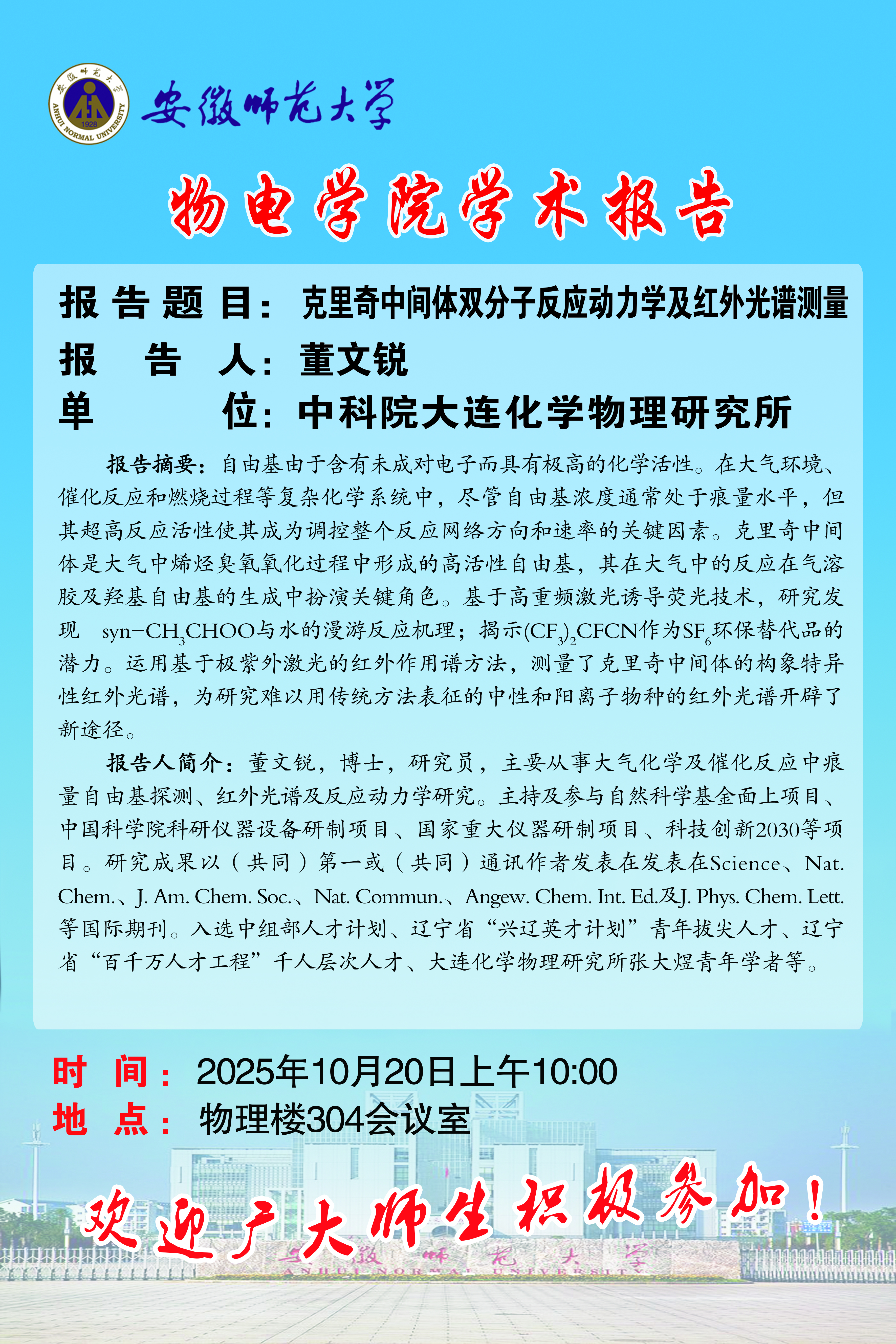 【学术预告】物电讲坛2025年第38期:克里奇中间体双分子反应动力学及红外光谱测量