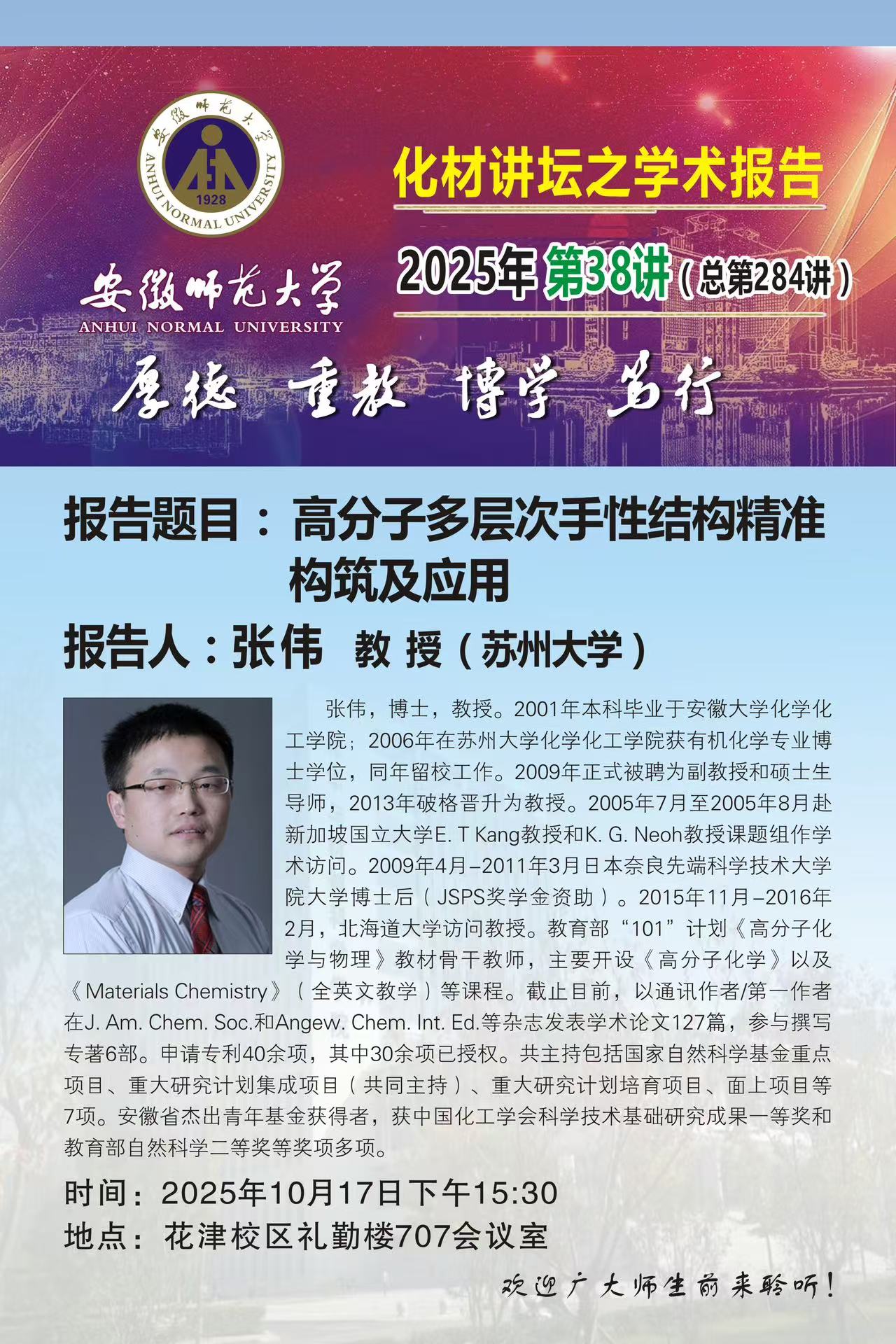 【学术预告】化材讲坛2025年第38讲:高分子多层次手性结构精准构筑及应用