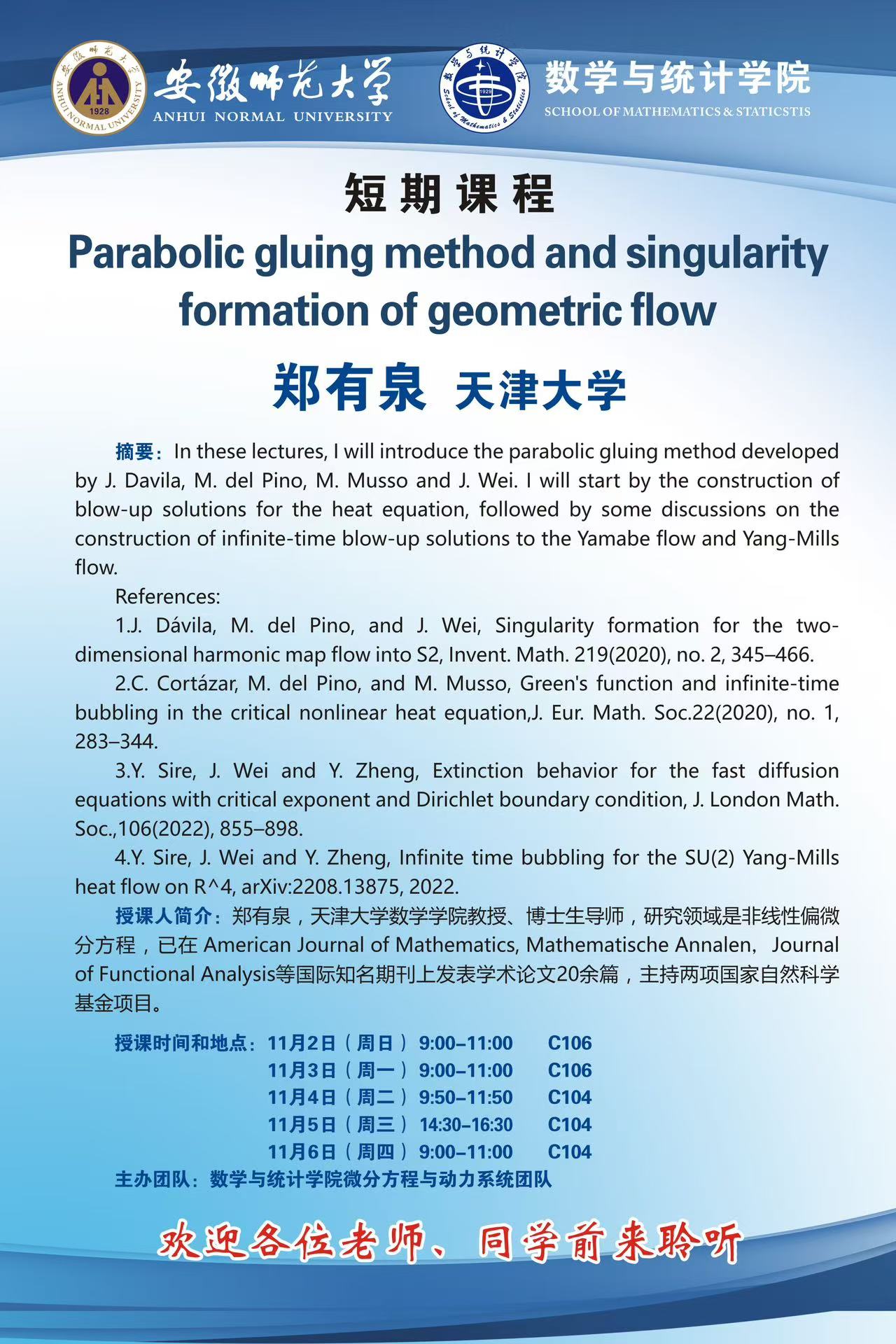 【学术预告】数统学院短期课程:Parabolic gluing method and singularity formation of geometric flow