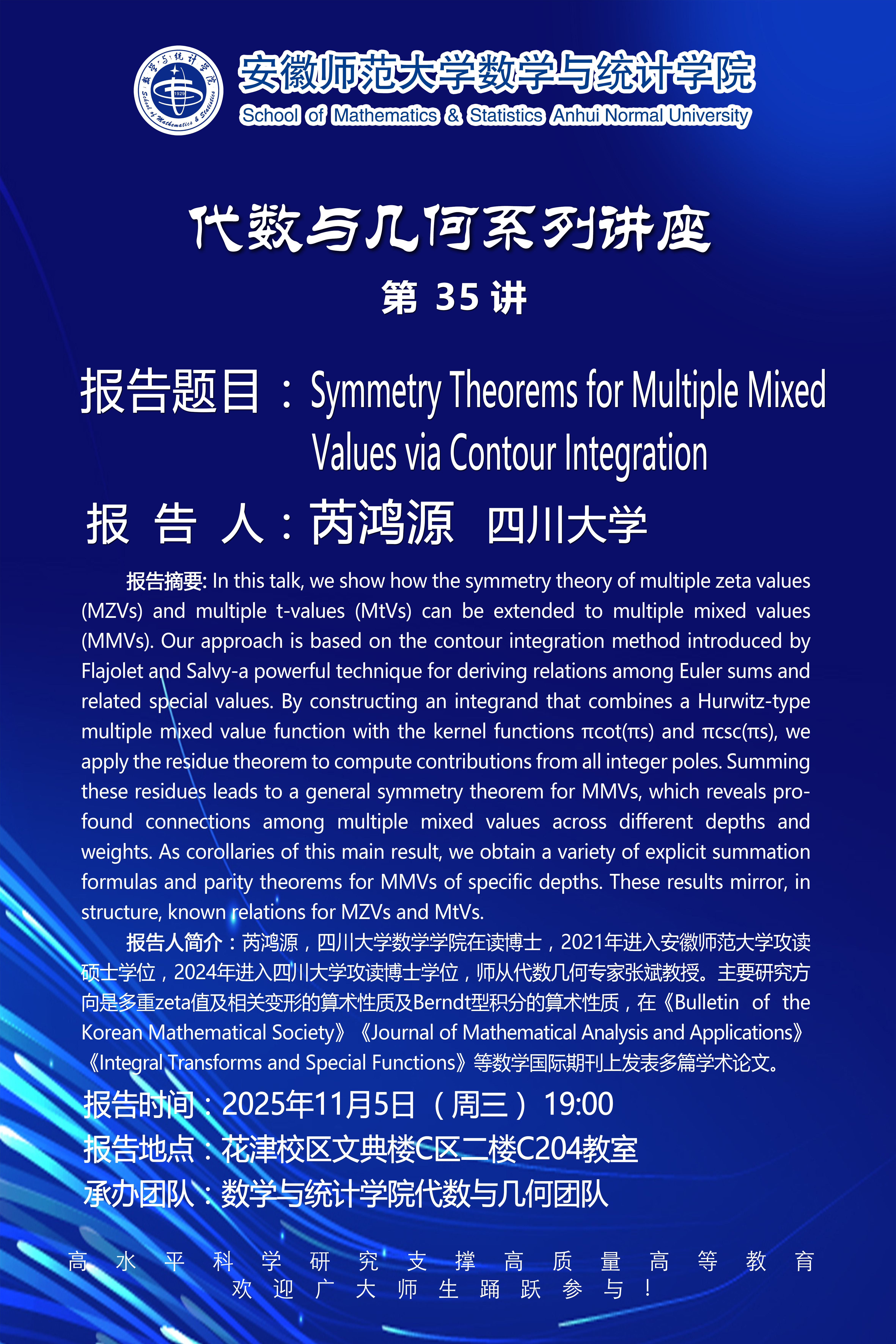 【学术预告】数学与统计学院代数与几何系列讲座第35讲:Symmetry Theorems for Multiple Mixed Values via Contour Integration