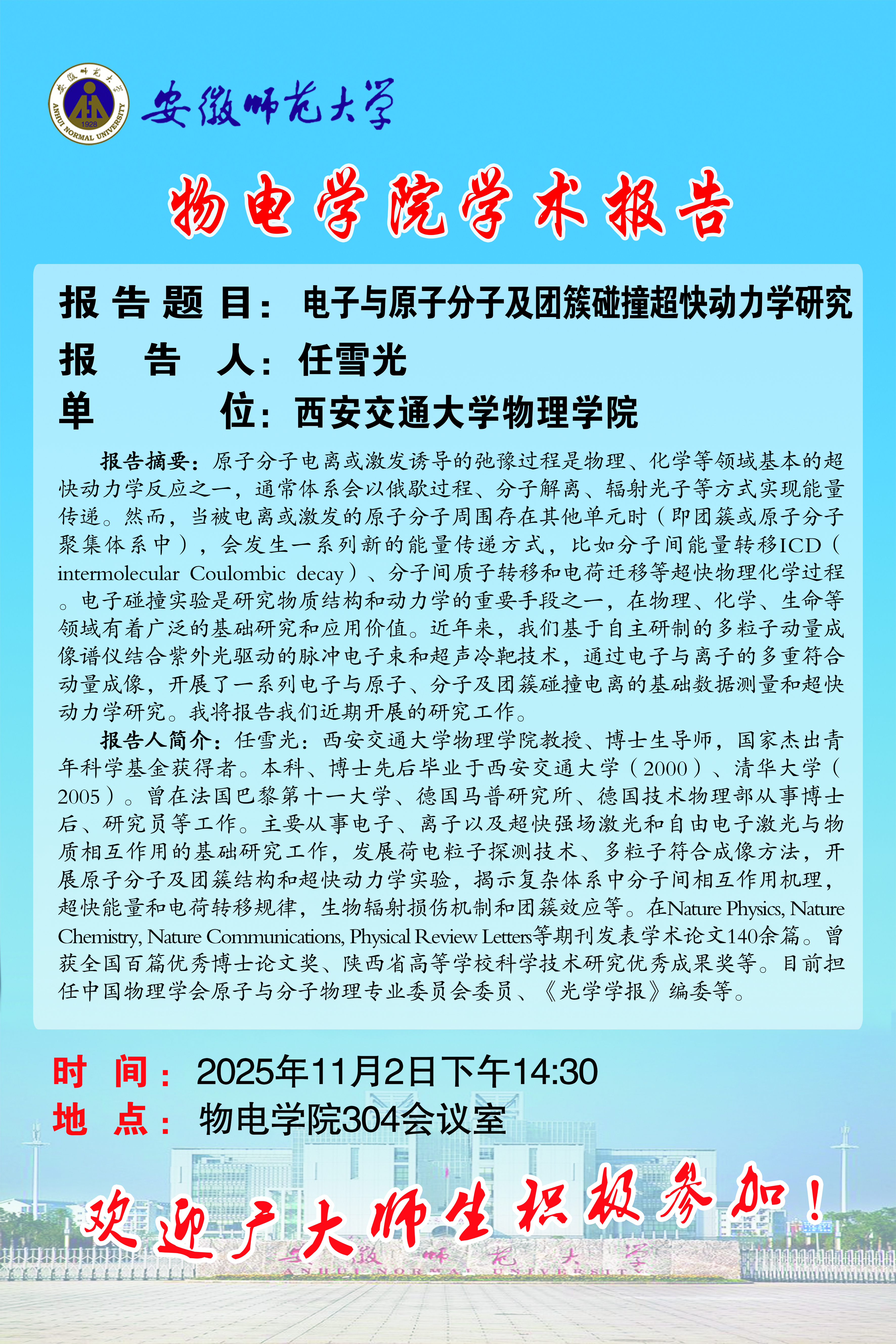 【学术预告】物电讲坛2025年第44期:电子与原子分子及团簇碰撞超快动力学研究