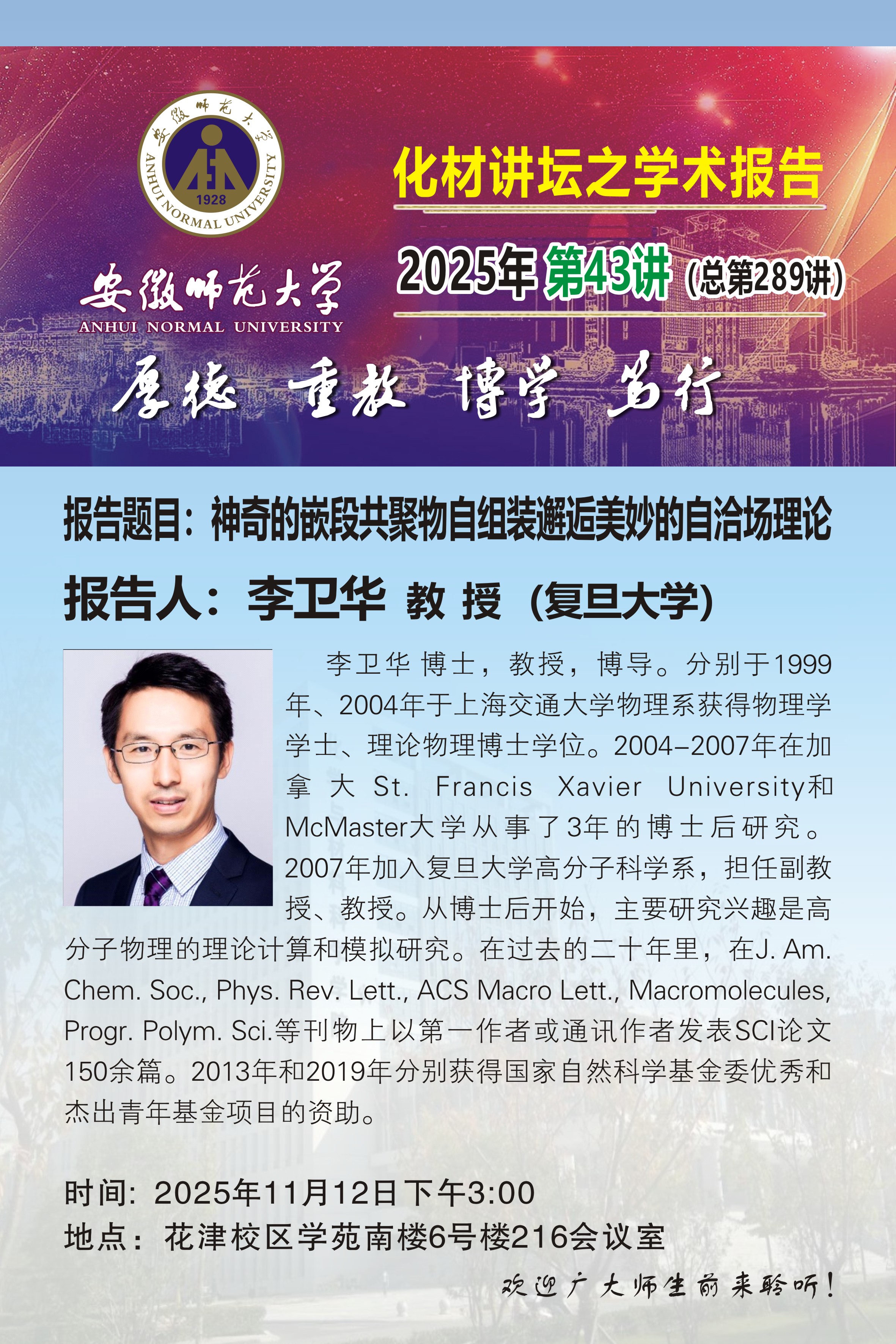 【学术预告】化材讲坛2025年第43讲:神奇的嵌段共聚物自组装邂逅美妙的自洽场理论