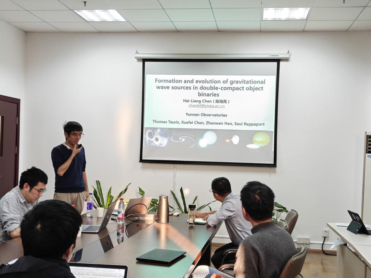 应物理与电子信息学院邀请,中国科学院云南天文台研究员陈海亮于11月12日来校进行学术交流,并做了题为《Formation and evolution of gravitational wave sources in white dwarf binaries and neutron star binaries》的学术报告。报告会在物电学院429会议室举行,物电学院教授舒新文主持报告会,相关专业师生参加了此次报告会。
