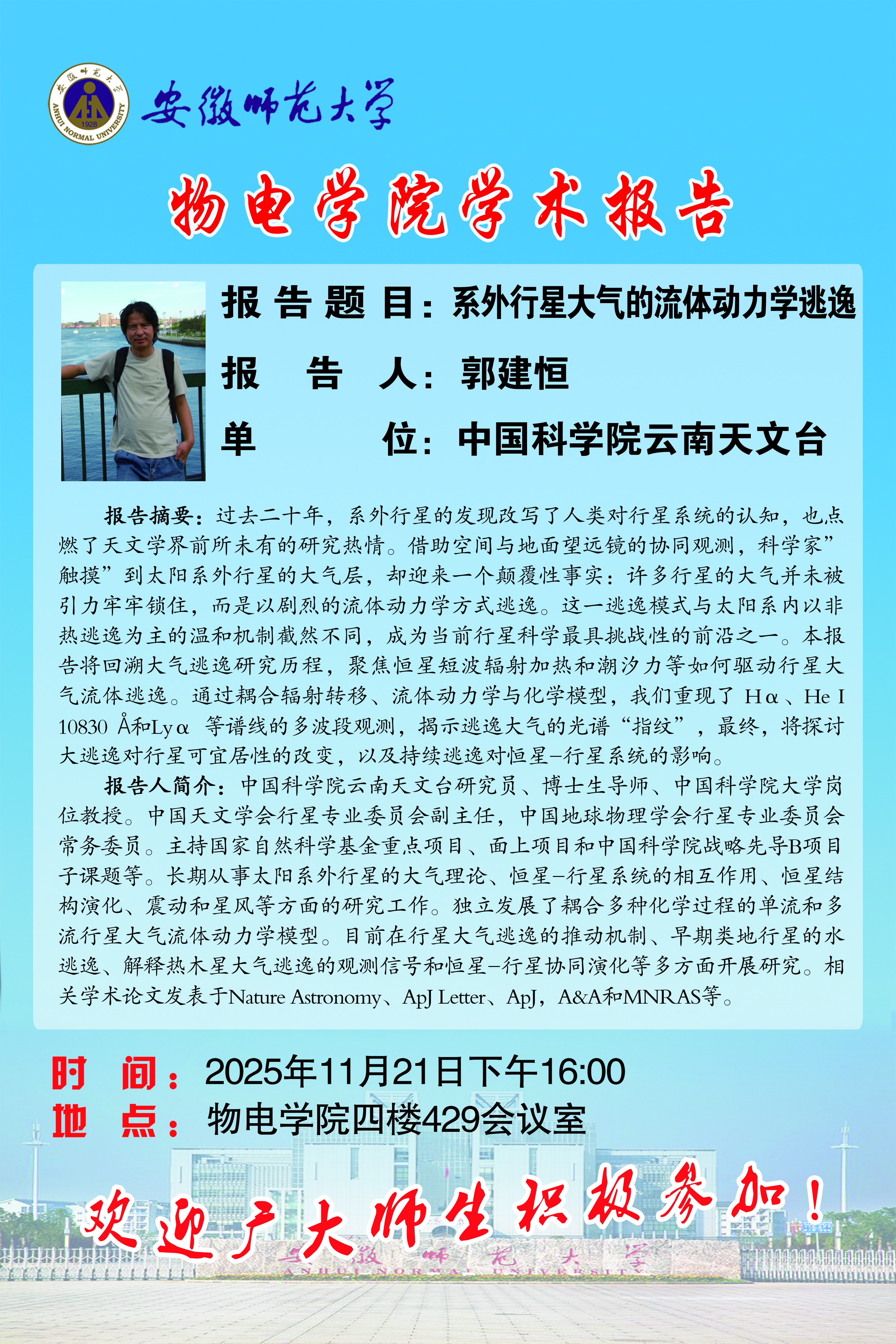 【学术预告】物电讲坛2025年第48期:系外行星大气的流体动力学逃逸
