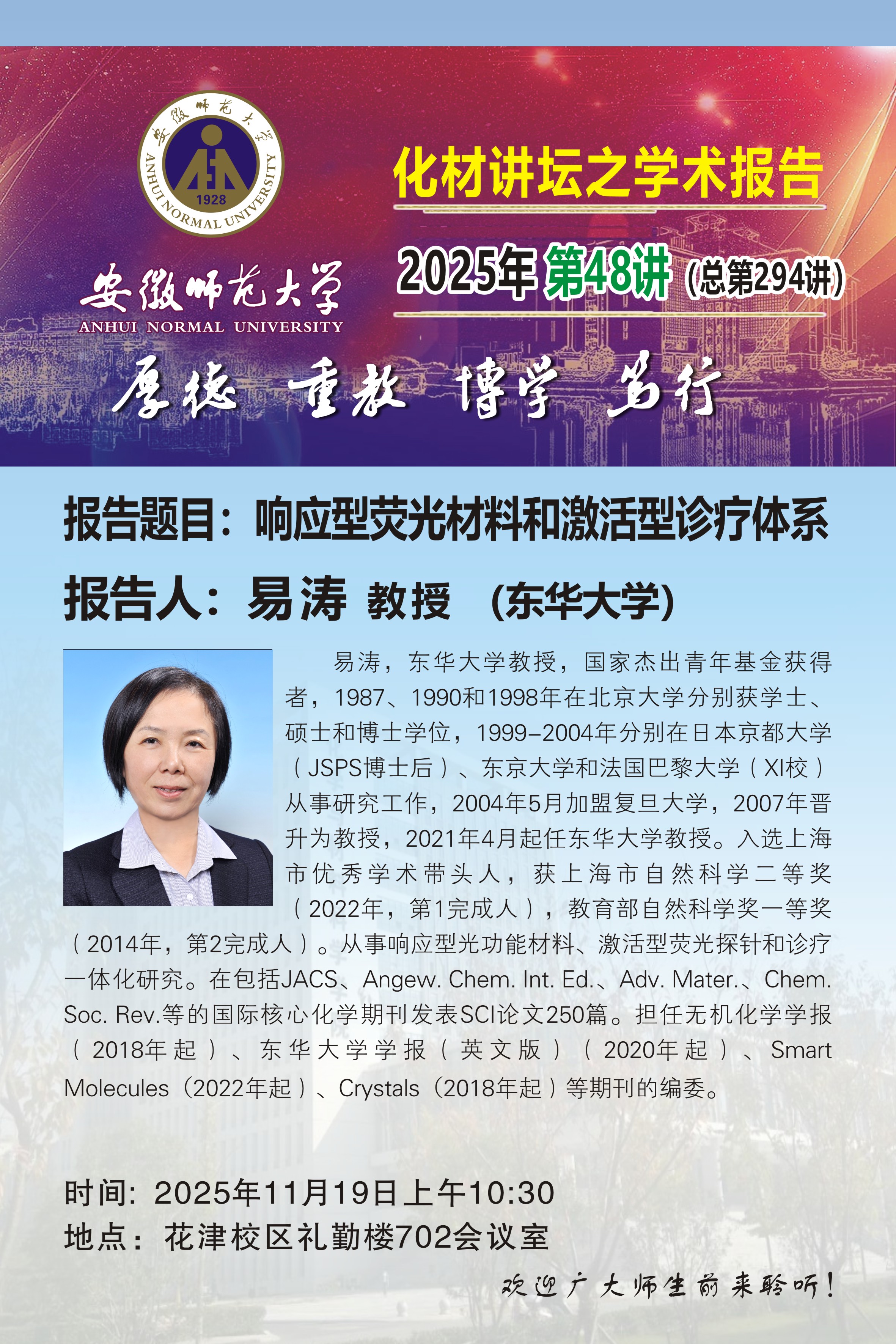 【学术预告】化材讲坛2025年第48讲:响应型荧光材料和激活型诊疗体系