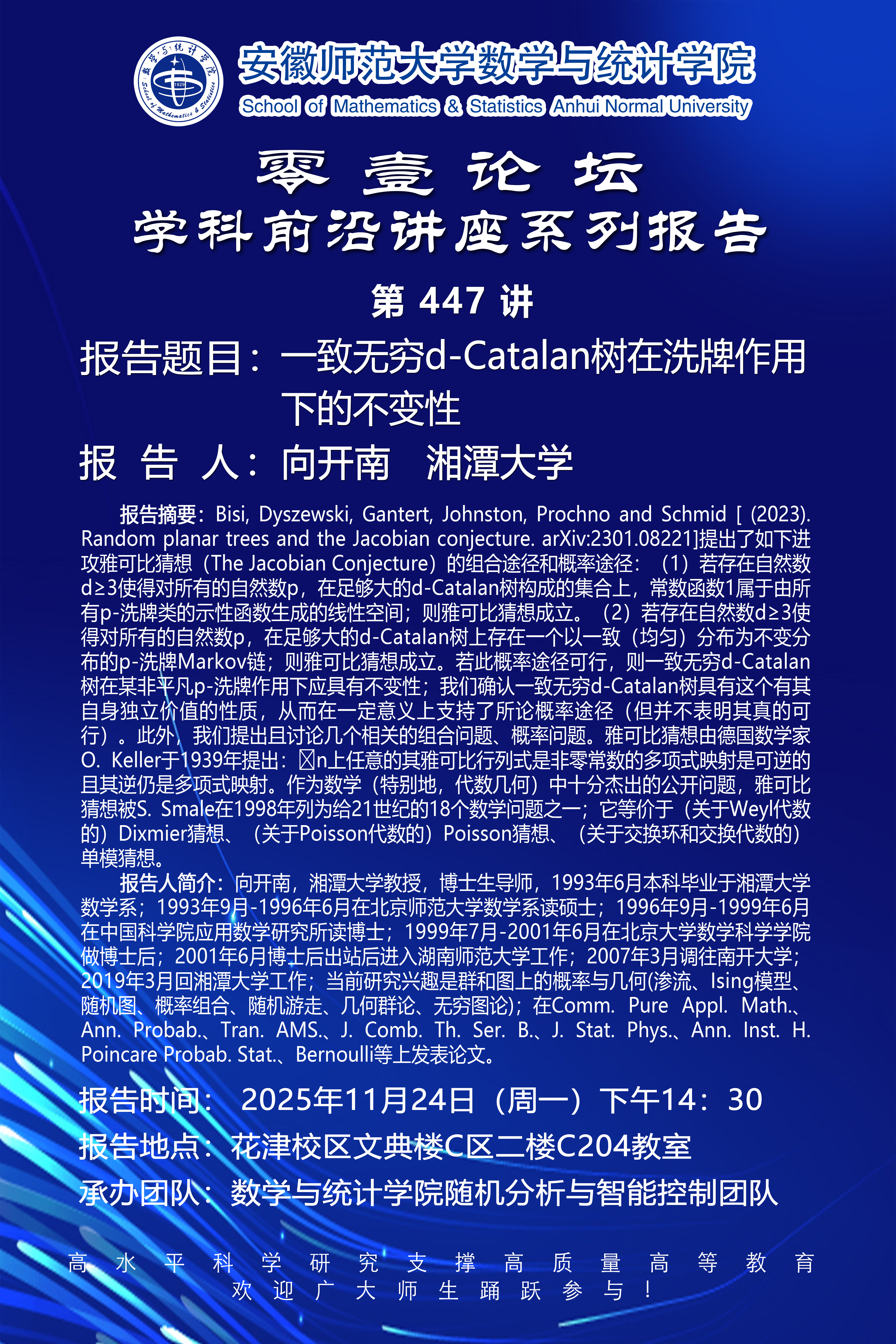 【学术预告】数统学院零壹论坛第447讲:一致无穷d-Catalan树在洗牌作用下的不变性