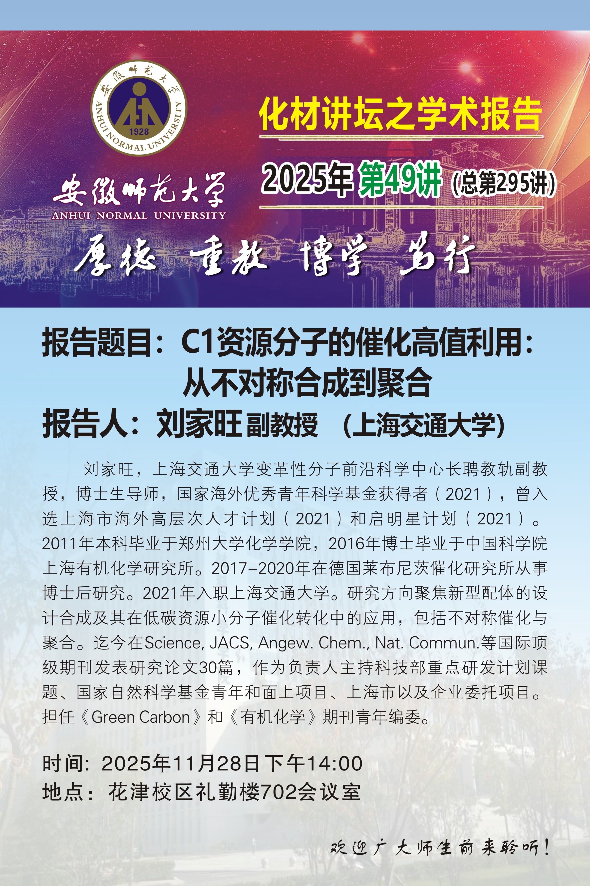 【学术预告】化材讲坛2025年第49讲:C1资源分子的催化高值利用:从不对称合成到聚合