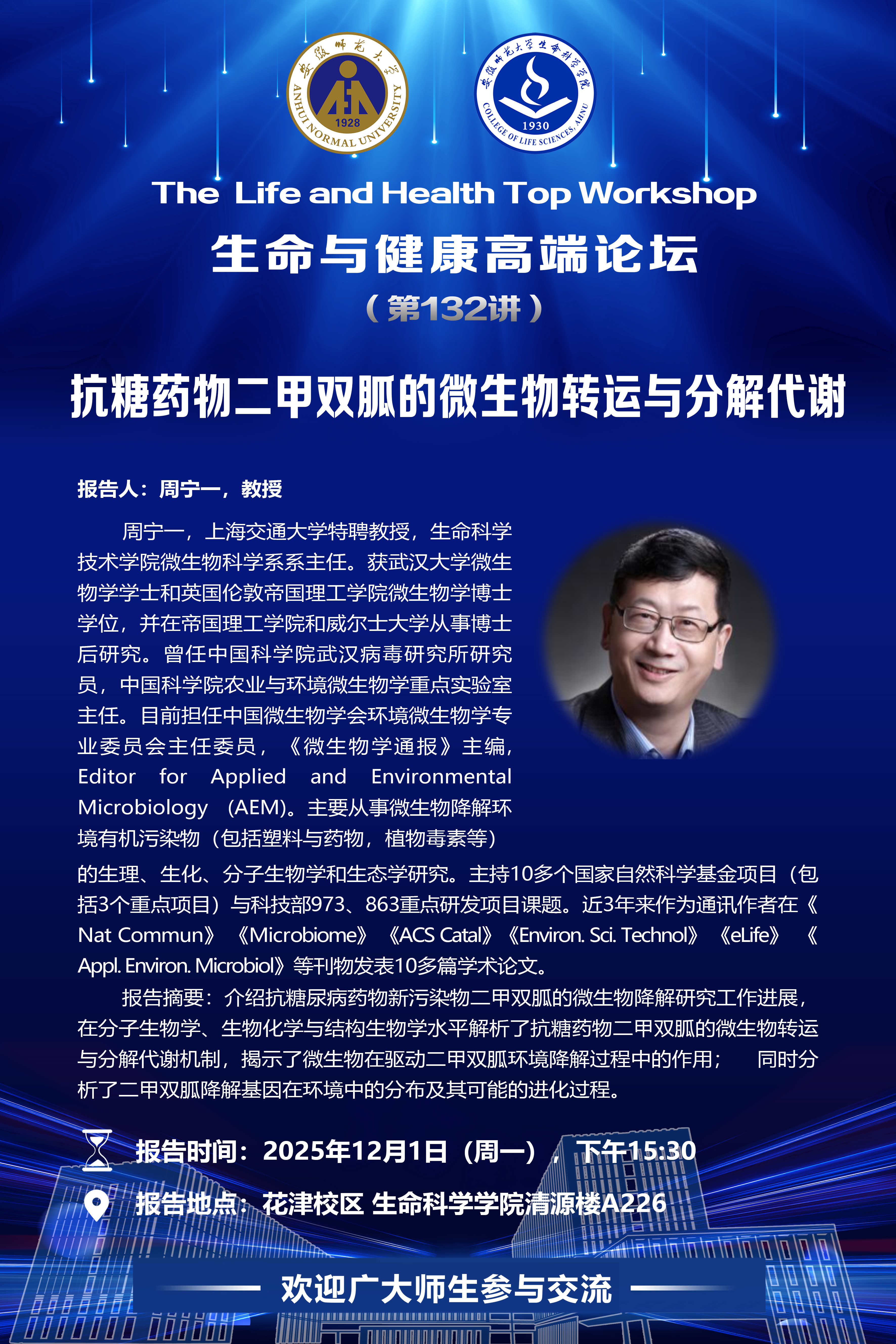 【学术预告】生命与健康高端论坛第132讲:抗糖药物二甲双胍的微生物转运与分解代谢