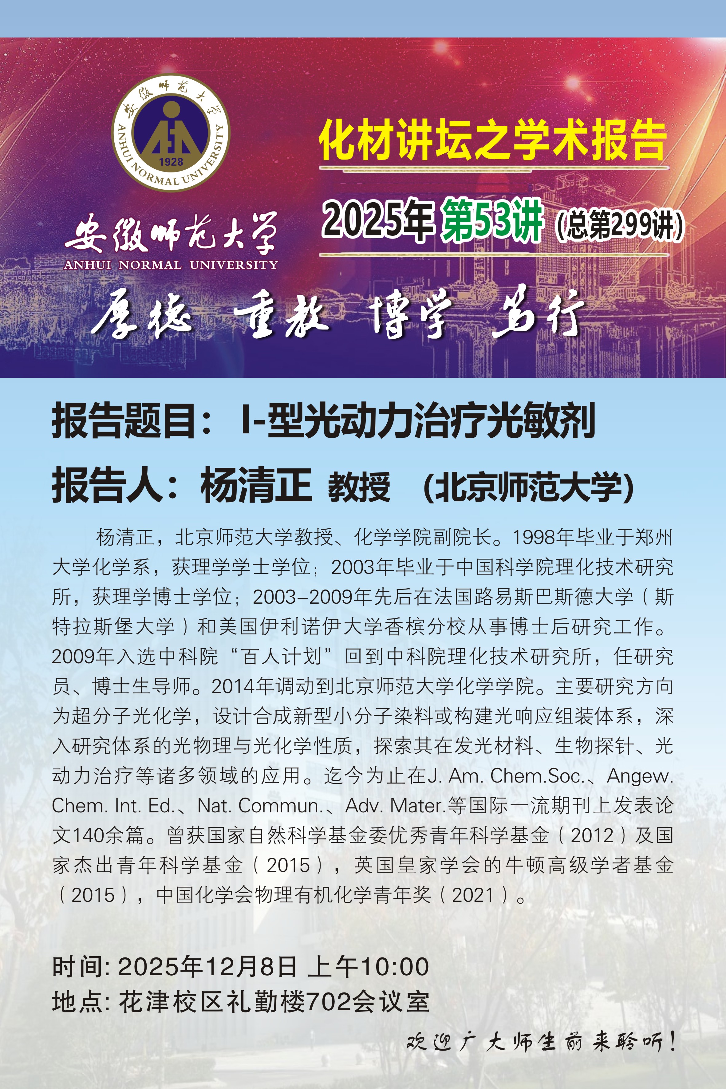 【学术预告】化材讲坛2025年第53讲:I-型光动力治疗光敏剂