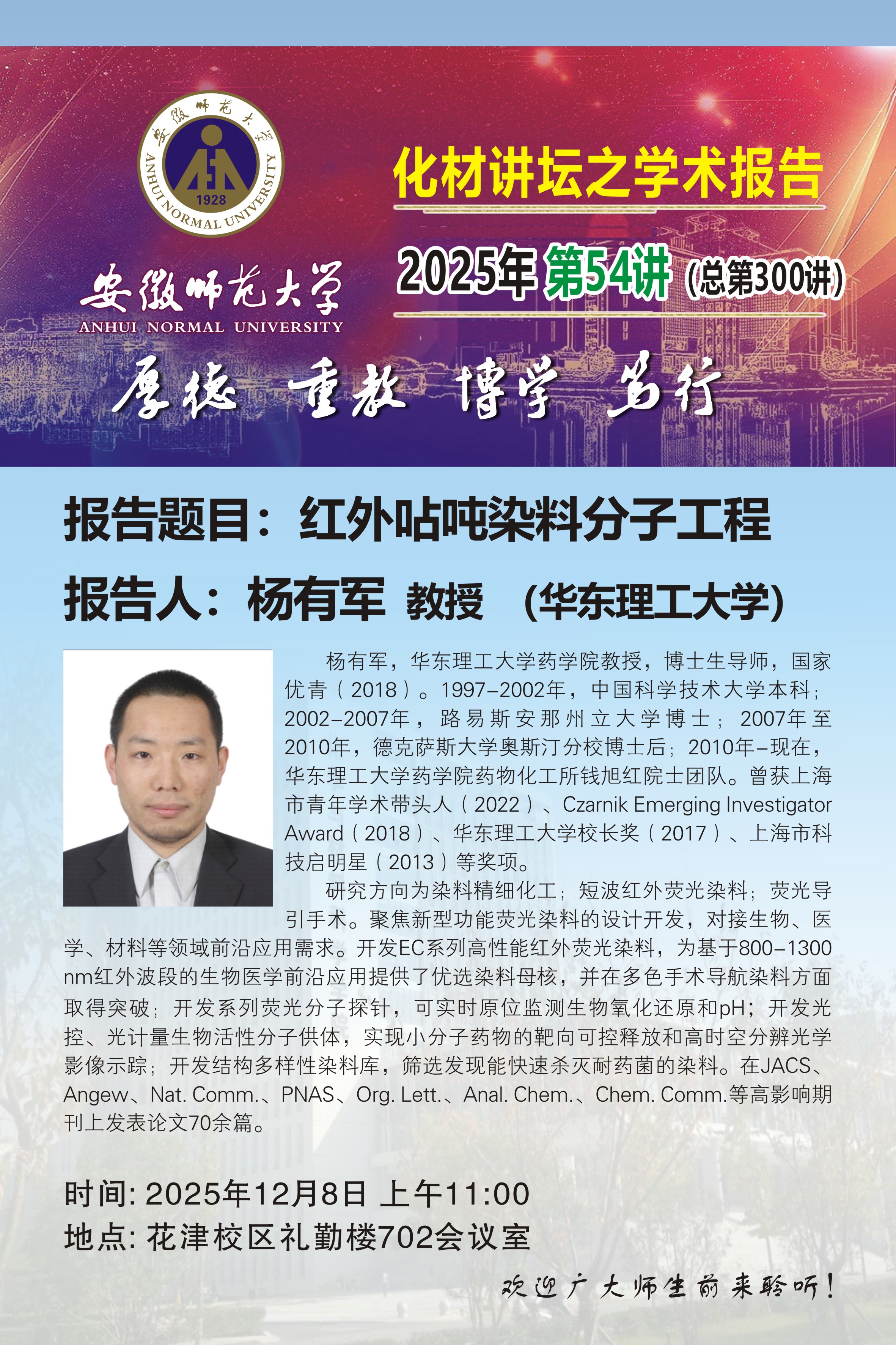 【学术预告】化材讲坛2025年第54讲:红外呫吨染料分子工程