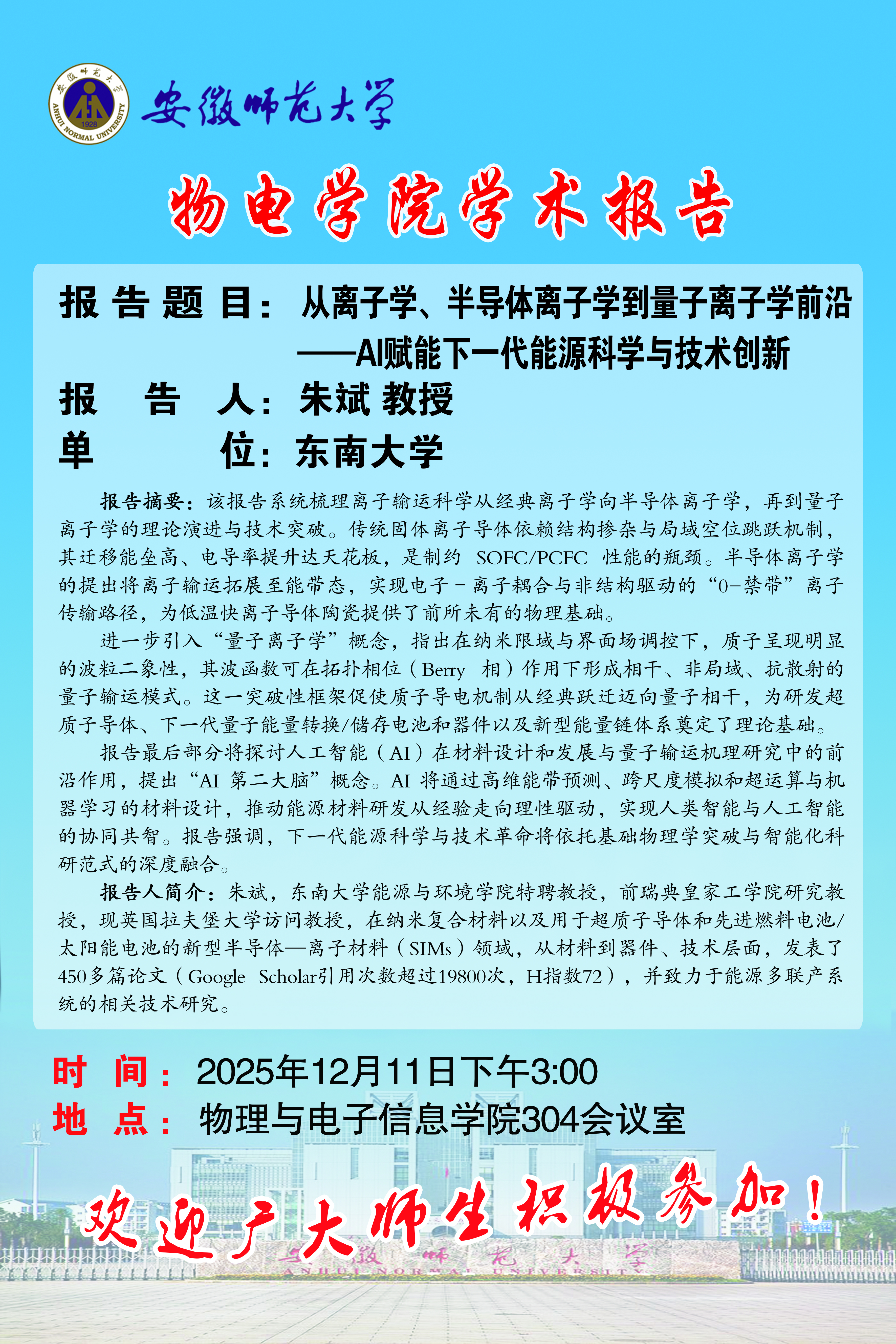 【学术预告】物电讲坛2025年第53期:从离子学、半导体离子学到量子离子学前沢AI赋能下一代能源科学与技术创新
