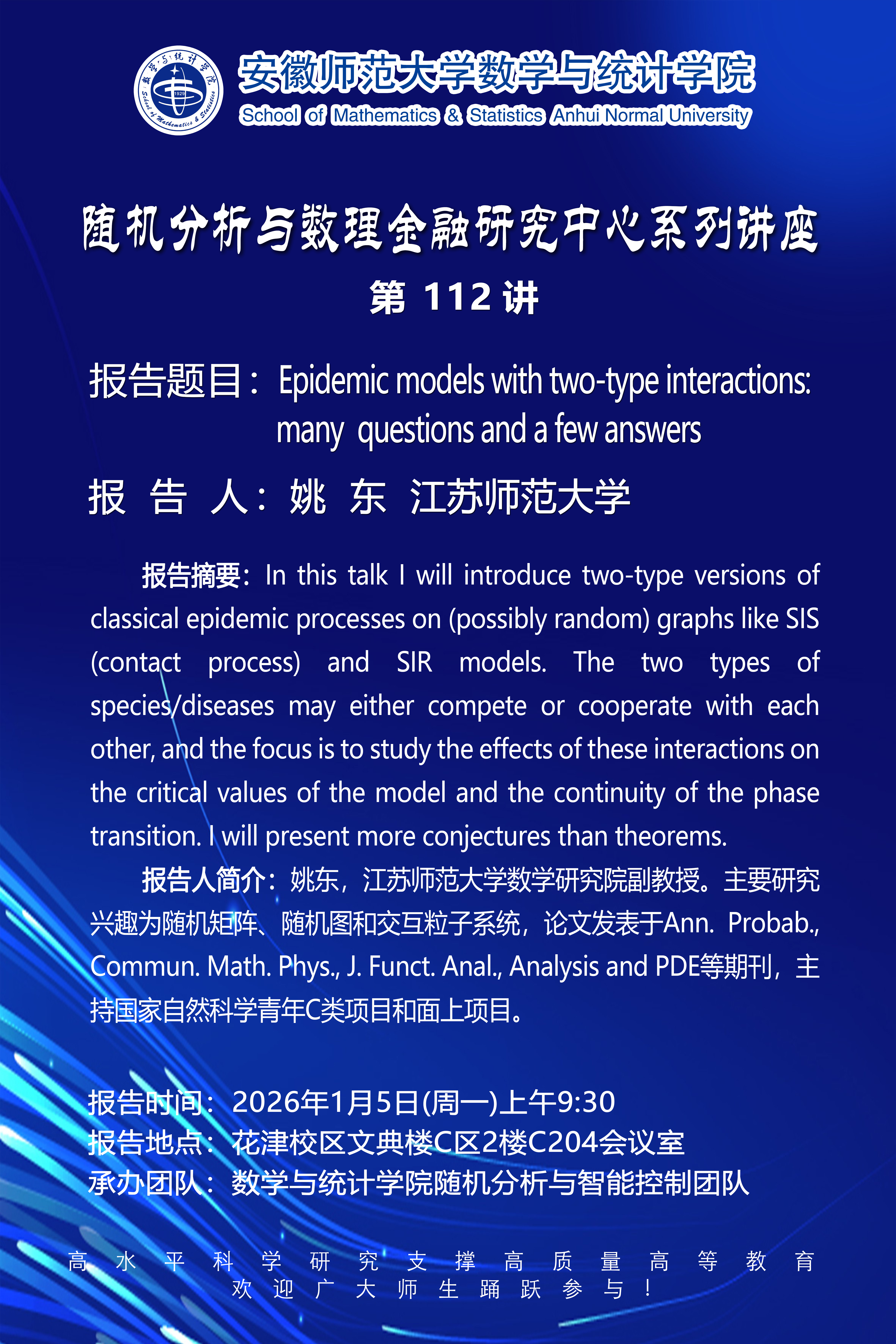 【学术预告】数统学院随机分析与数理金融研究中心系列讲座第112讲:Epidemic models with two-type interactions: many questions and a few answers