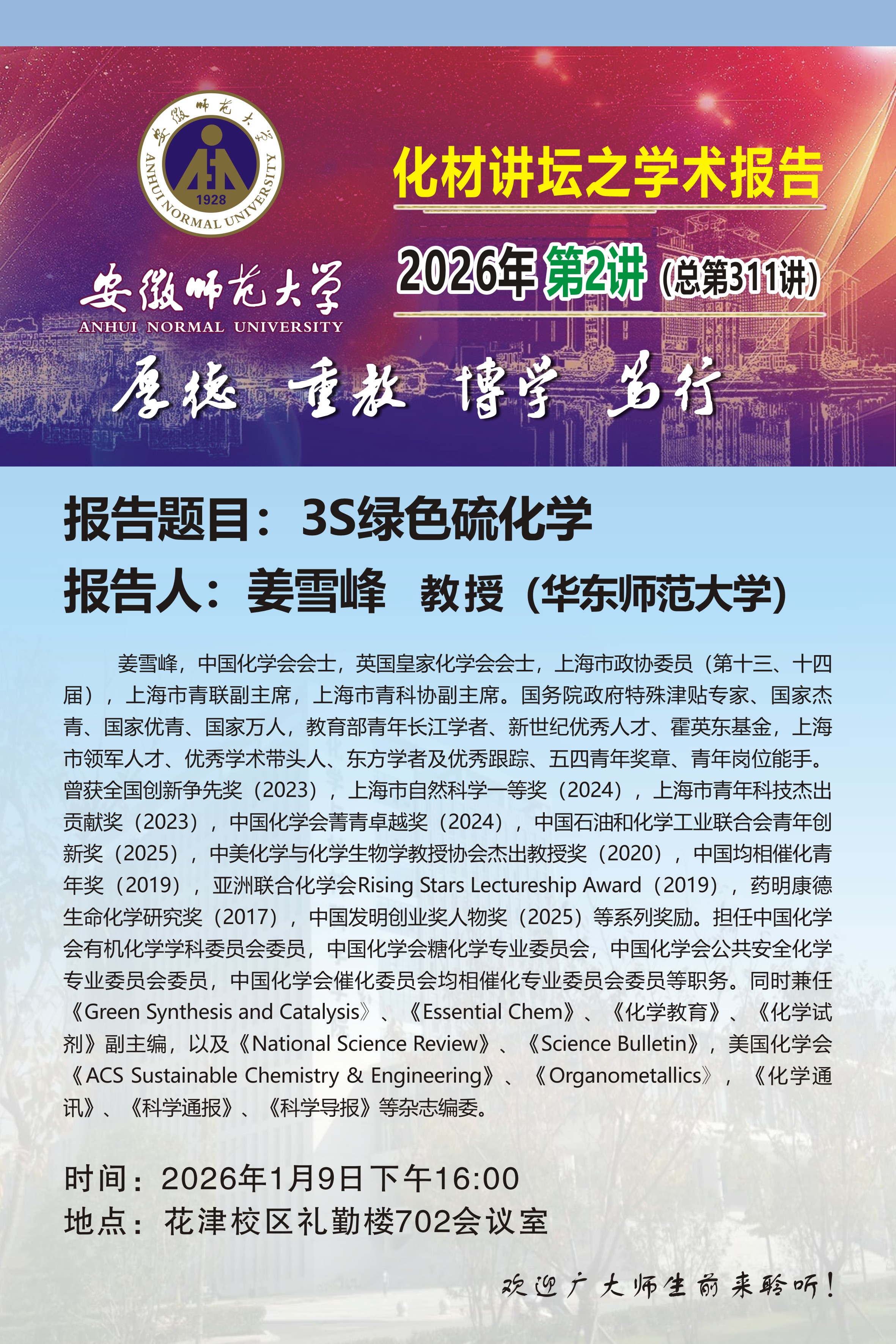 【学术预告】化材讲坛2026年第2讲:3S绿色硫化学