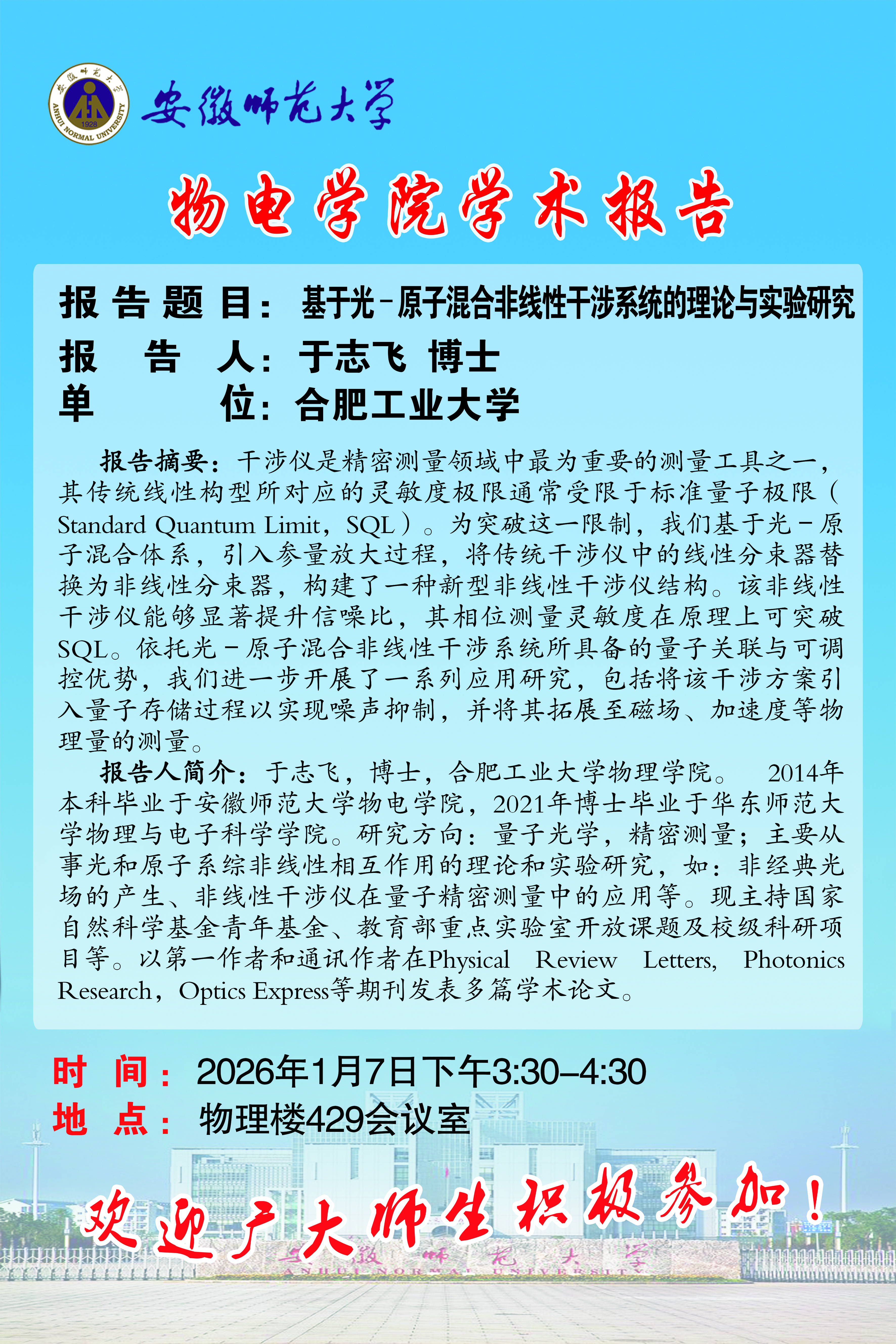 【学术预告】物电讲坛2026年第1期:基于光–原子混合非线性干涉系统的理论与实验研究