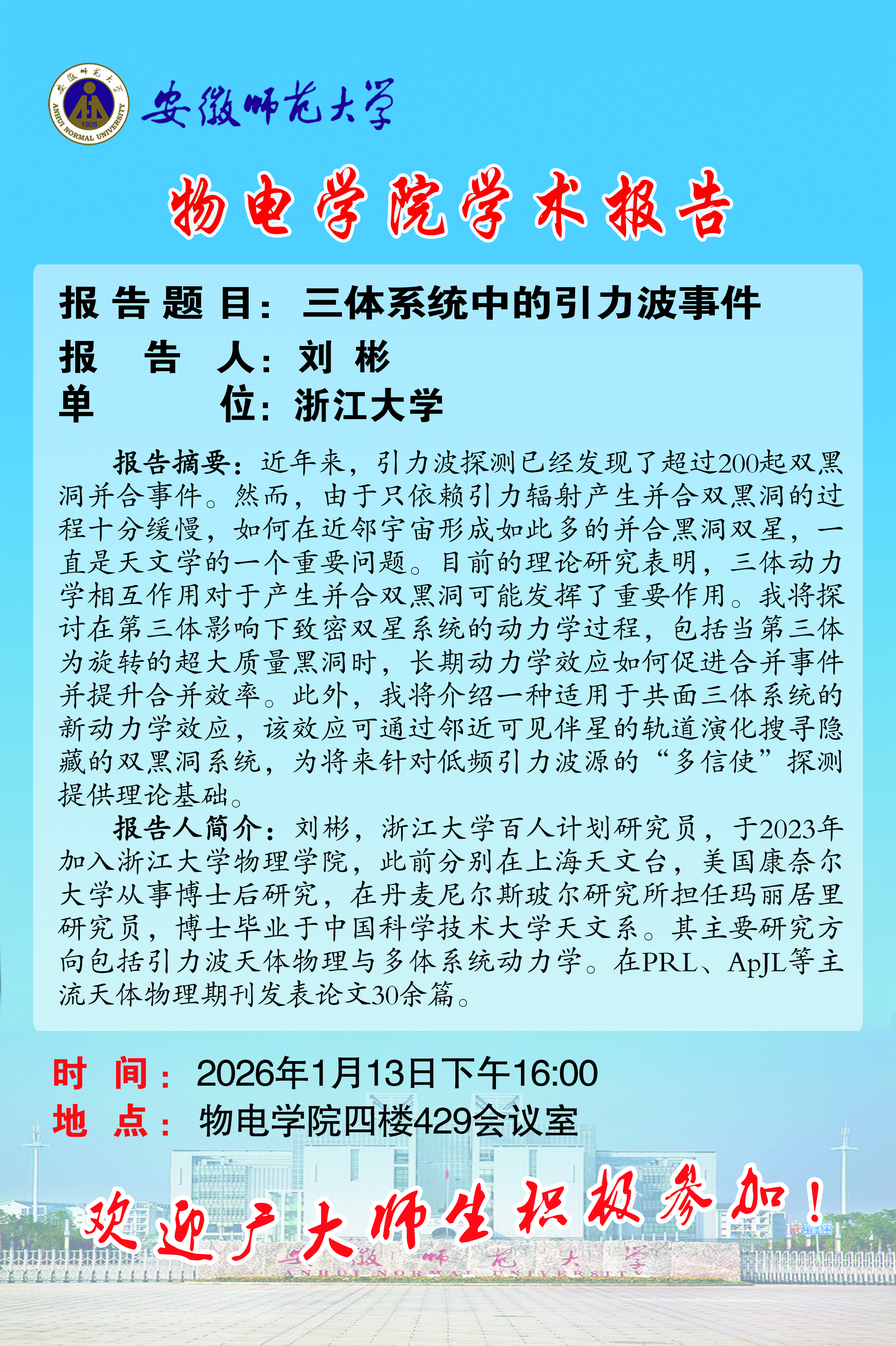 【学术预告】物电讲坛2026年第3期:三体系统中的引力波事件