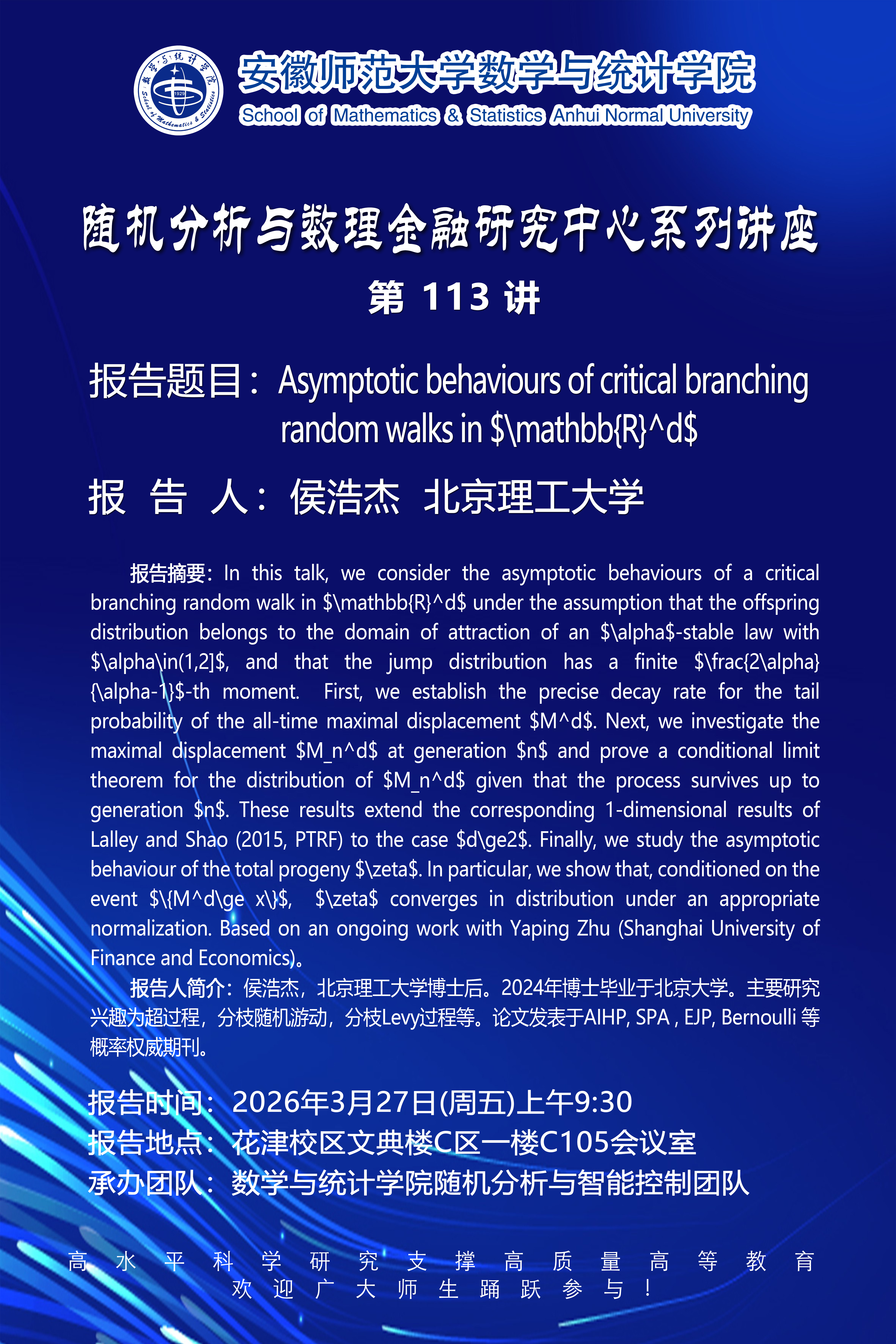 【学术预告】数统学院随机分析与数理金融研究中心系列讲座第113讲:Asymptotic behaviours of critical branching random walks in $\mathbb{R}^d$