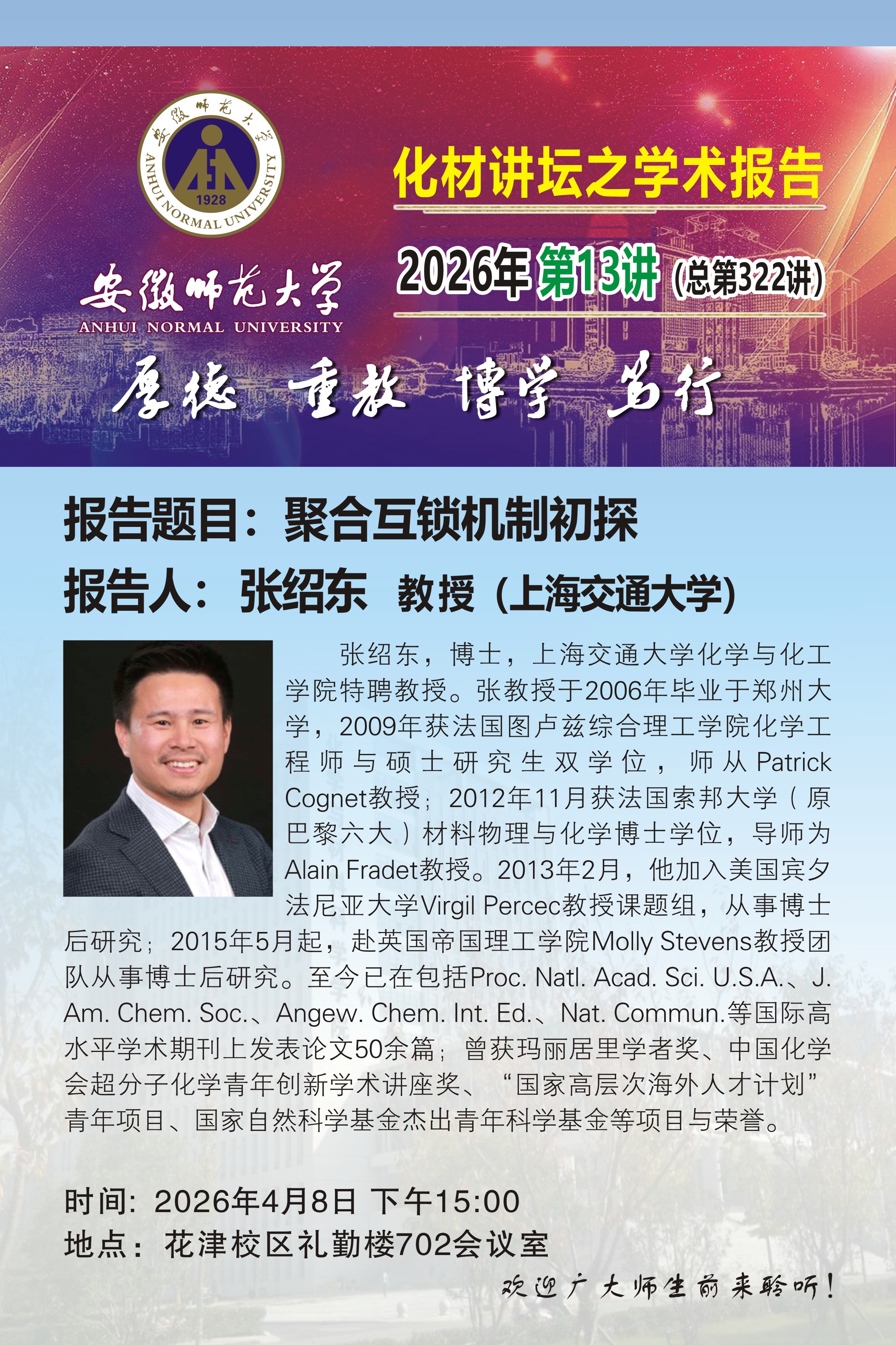 【学术预告】化材讲坛2026年第13讲:聚合互锁机制初探