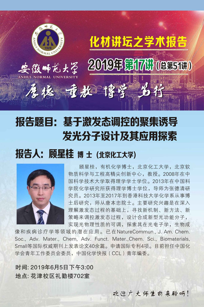 【学术预告】化材讲坛系列学术报告2019年第17讲:基于激发态调控的聚集诱导发光分子设计及其应用探索