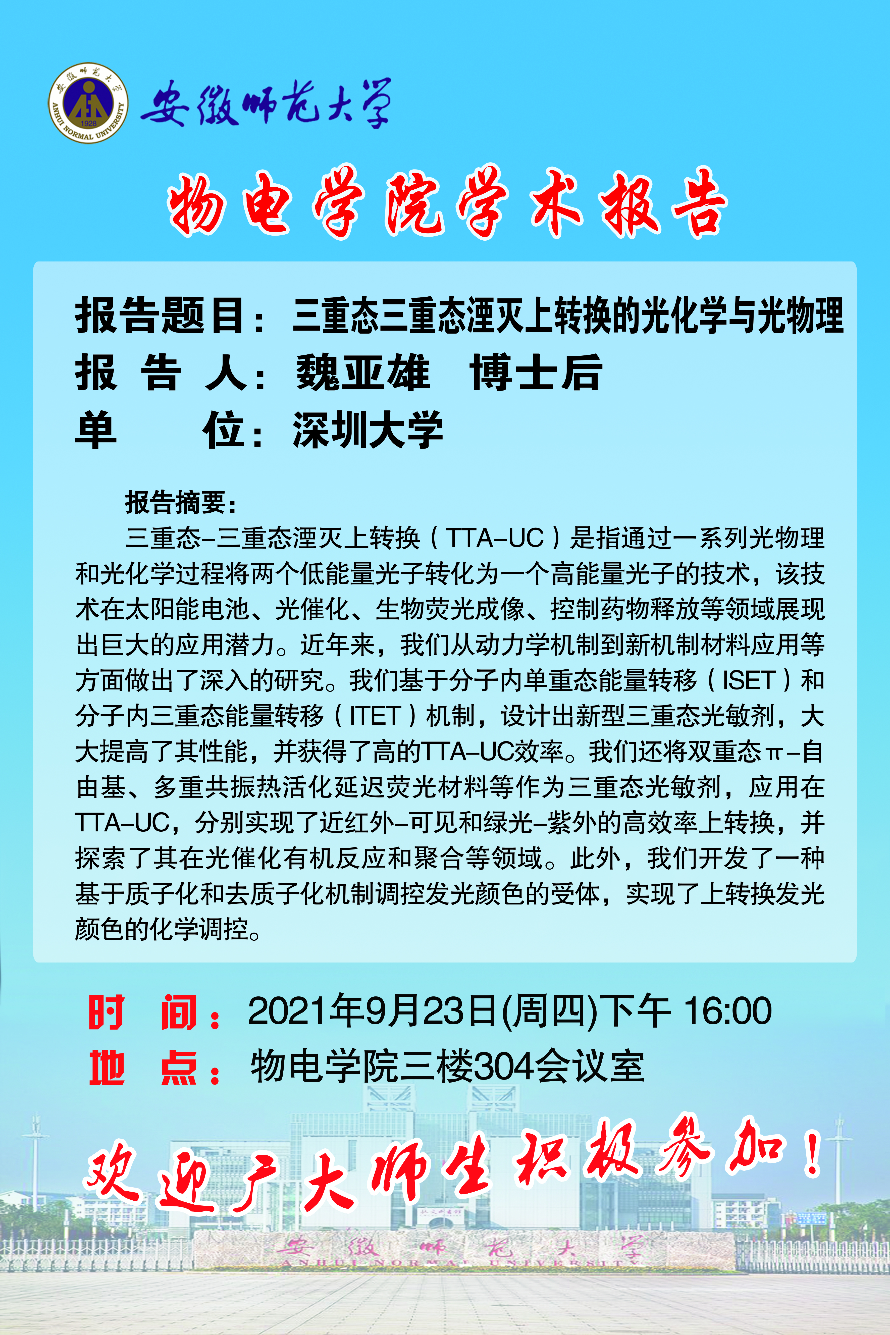 【学术预告】魏亚雄:三重态三重态湮灭上转换的光化学与光物理